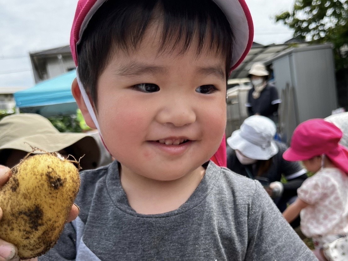 月曜日、地域の方々にも手伝っていただき、じゃがいも収穫をしました。緑の茎を引っ張るとたくさんのじゃがいもが土の中から出てきましたよ!!2歳の子どもたちは慣れた手つきで収穫していきます。そして収穫したじゃがいもを自分たちで次から次へとコンテナに運んで行くんですよ!1歳の子どもたちも、お兄ちゃんやお姉ちゃんの姿を見て、どんどん運んで行きます。あっという間にコンテナはじゃがいもでいっぱいになりました!!みんなで収穫したじゃがいもが給食に出てくるのはいつかなー♡♡楽しみですね!