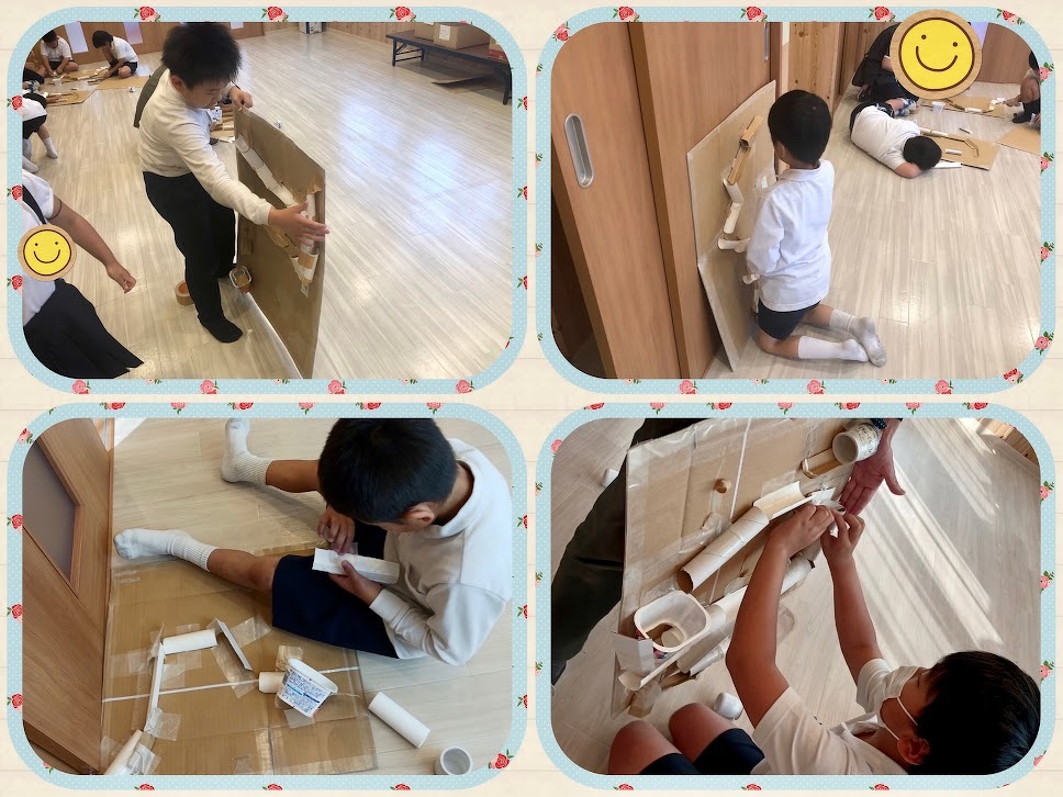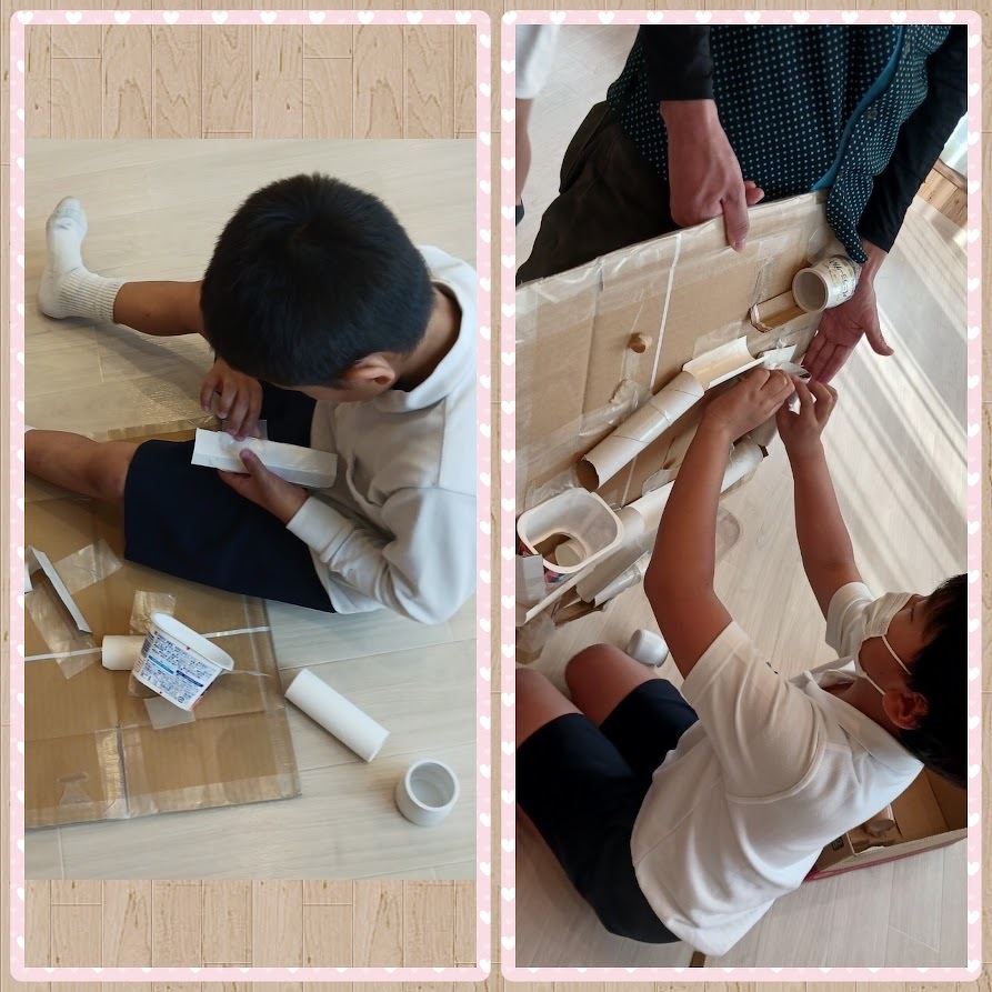 2023年06月19日(月) 活動ブログ アイリー・らぼ☆ピタゴラスイッチ作ったよ! こんにちは!アイリー・らぼ放デイです。 今週は制作でピタゴラスイッチを作りました。 みんな先生から渡された材料をもとにテープ貼ったりして作りました。 みんなやり始めると黙々と作っていきます。 先生の力を借りずに自分の力で作ったり、細かいところまでこだわって作ることも出来ました。 完成するとみんな何度もビー玉を転がして遊んでいました。 みんな嬉しそうに自分のピタゴラスイッチで遊んだり、お友達ので遊んだりしていました。