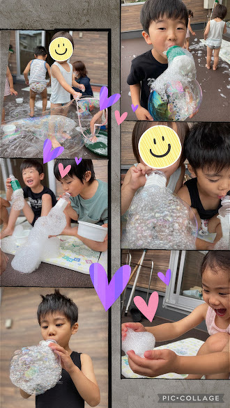 上の写真は、つばめ・ぺんぎんグループさんの、泡あそびの時の様子です。