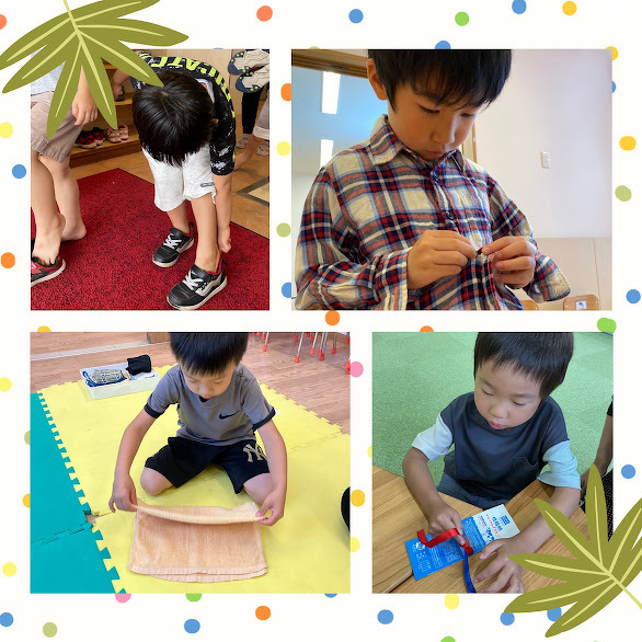 「タオルは、端っこを合わせて~」と言いながら畳んでいました。