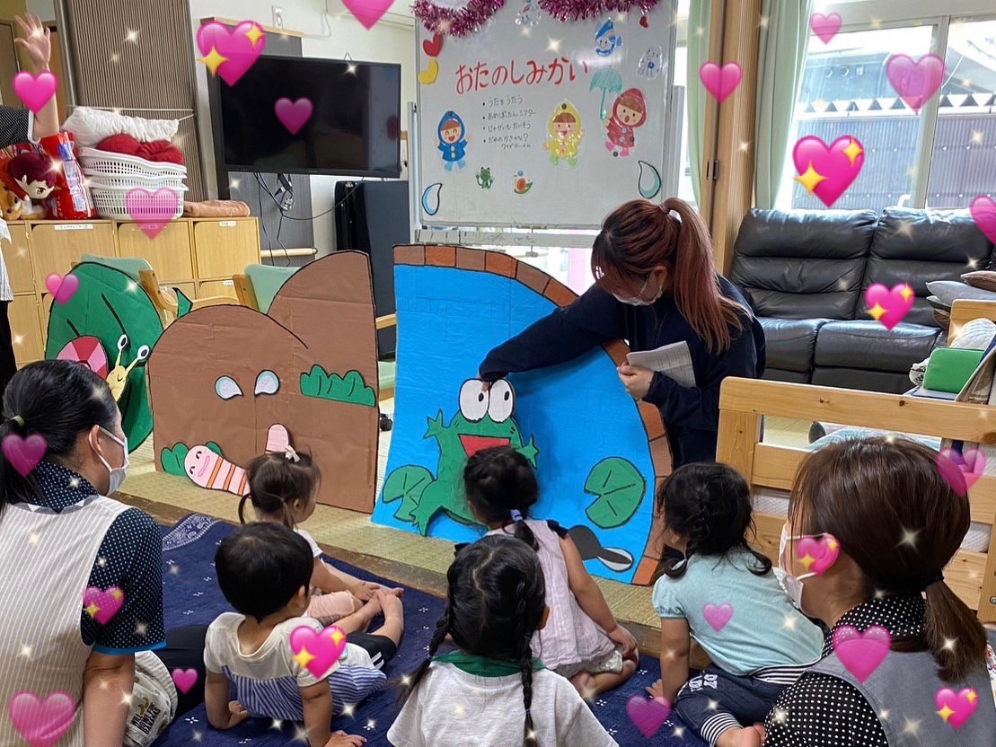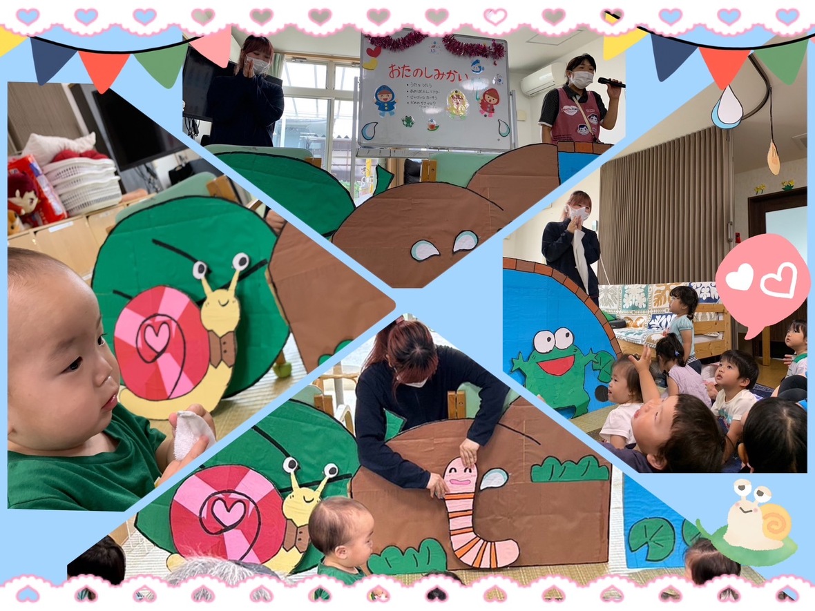 とても可愛らしい”あまだれぽったんシアター”段ボールで作った大きな”かたつむり”に大はしゃぎ!”ミミズ”はちょっと馴染みがなく出てきても子どもたちの頭は”?”だったけど”カエル”出現で大喜びでした。利用者さんも子どもたちも楽しんでいましたよ。「わ~」「キャ~」「かわいい♡」