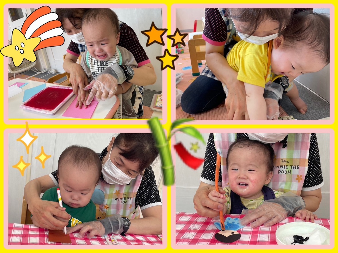 手が汚れると涙がいっぱい出ちゃうけど、手が汚れない遊びだと”まだするー””まだしたーい”と遊びを楽しんでいる姿もみられました。いよいよ来週が七夕ですね。それまでに頑張って作るね。