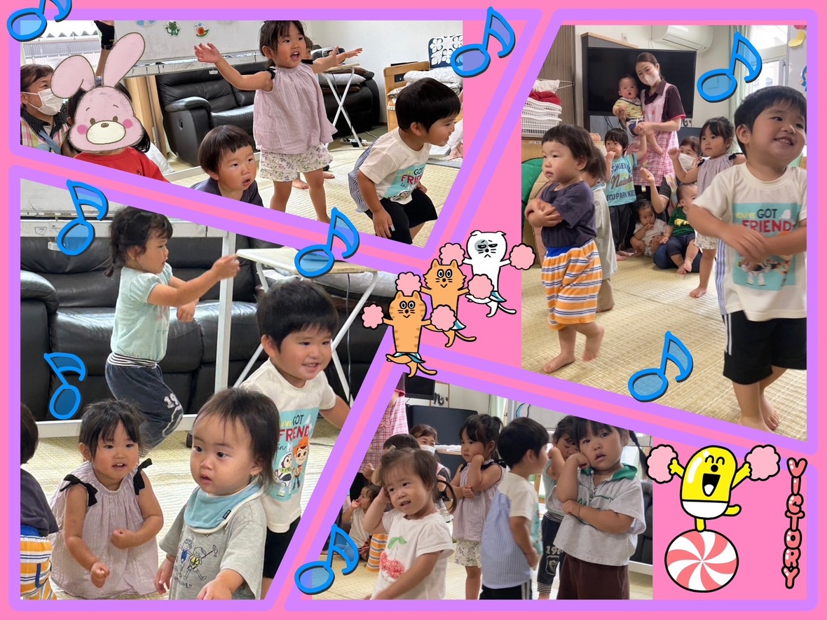 ノリノリの曲でとても楽しい曲です。6月の体操で子どもたちは毎日踊り、その踊りを利用者さんに見てもらいました。踊りを見てもらえて嬉しい子どもたち、少し照れながらも踊っていましたよ。子どもたちの姿を見た利用者さんは、再び「可愛い♡可愛い♡」の連発でした。
