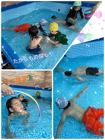 プールの中で力を抜いて水に顔をつけたまま浮かんだりワニ泳ぎに挑戦しました。プールの中にフラフープを入れると楽しそうにワニ泳ぎで気持ちよさそうにスイスイ泳いでいます。また、お友達と一緒にキラキラの宝物を探したり「一緒に持って行こ」と優しく声をかけてくれています。