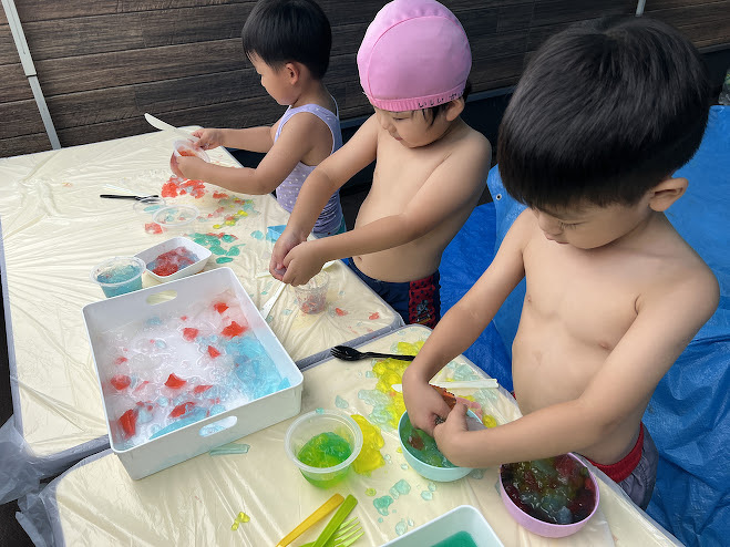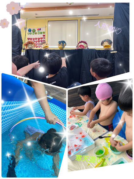 水の中に顔をつけることが苦手なお友達も今では鼻をつまんで顔をつけることが出来るようになりました。14日に寒天あそびをしました。冷たくてプルンプルンした寒天を切ったりぐちゃぐちゃに潰してお皿に盛り付けをして楽しみました。18日にのどかⅡの利用者の方が人形劇を披露してくれました。劇の話を聞いたり、人形に話しかけたりしながら楽しそうに見ることが出来ました。
