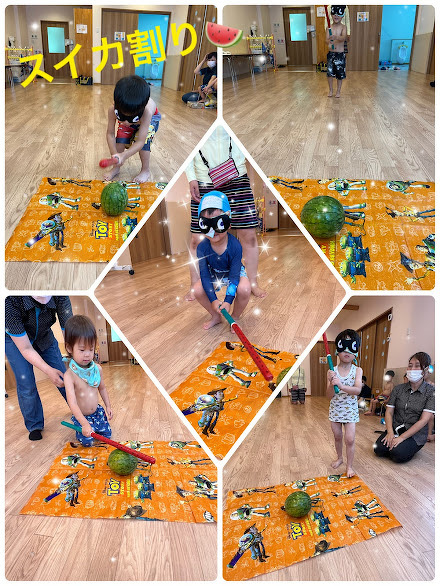 21日金曜日に夏ならではのすいか割りをしました。目隠しをして10回クルクル回った後にスイカの方へ歩いて行きました。中にはお友だちの座っている方に歩いて行ったり、他の場所に行くお友達もいました。みんなの掛け声でスイカにたどり着くことも出来ていました。みんな大きく振りかぶって割ろうと頑張っていました。