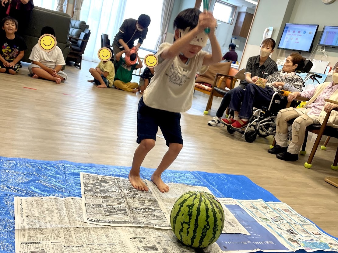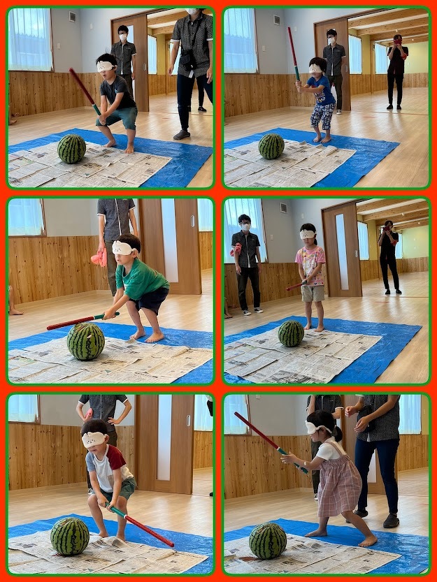 のどかのおじいちゃんおばあちゃんと、放課後ディサービスを利用しているお兄ちゃんお姉ちゃんたちと一緒に夏ならではのスイカ割りをしました。お泊り保育で一度スイカ割りを経験している年長さんは、目隠しされても不安になることなく、口元はとっても嬉しそうにスイカを目指して歩きます!!