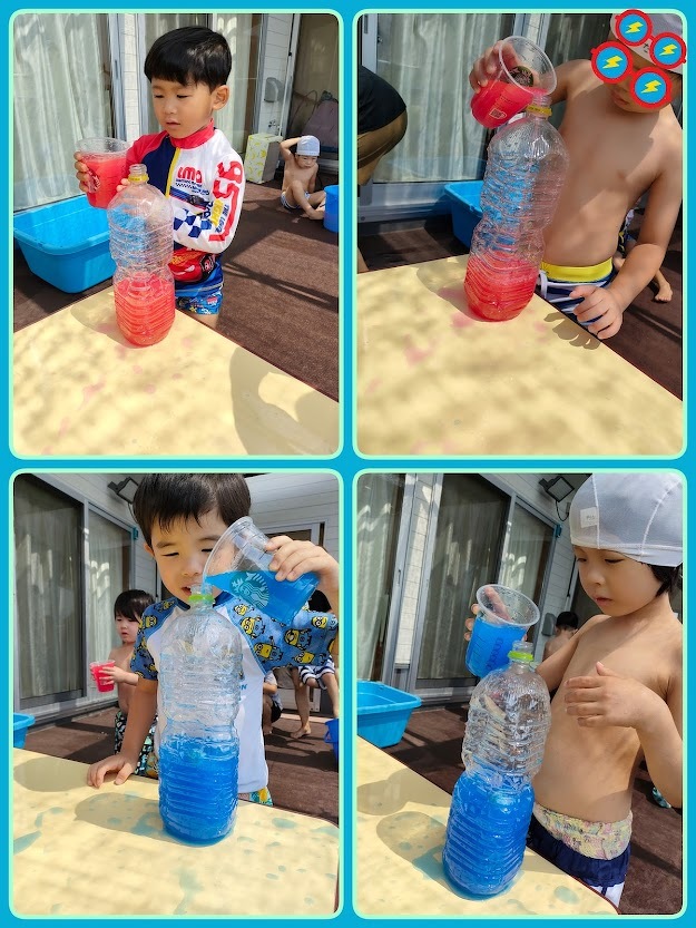 カップに入れたお水を、数メートル先にあるペットボトルに注いでいく遊びだったんですが、慎重にいく子、大胆にいく子それぞれでした。