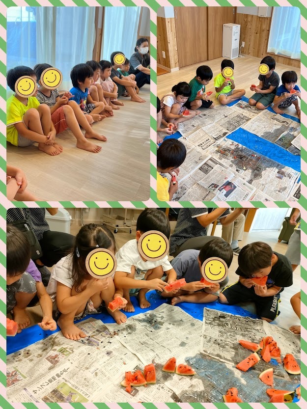 おまけ:はじまる前の「スイカの近くに行ったら、棒が当たって危ないから、順番がくるまで背中ぺったんでかっこよく待っていようね」というお約束を、しっかり守っていましたよ。さすが年長さん!!かっこいいね(^▽^)/