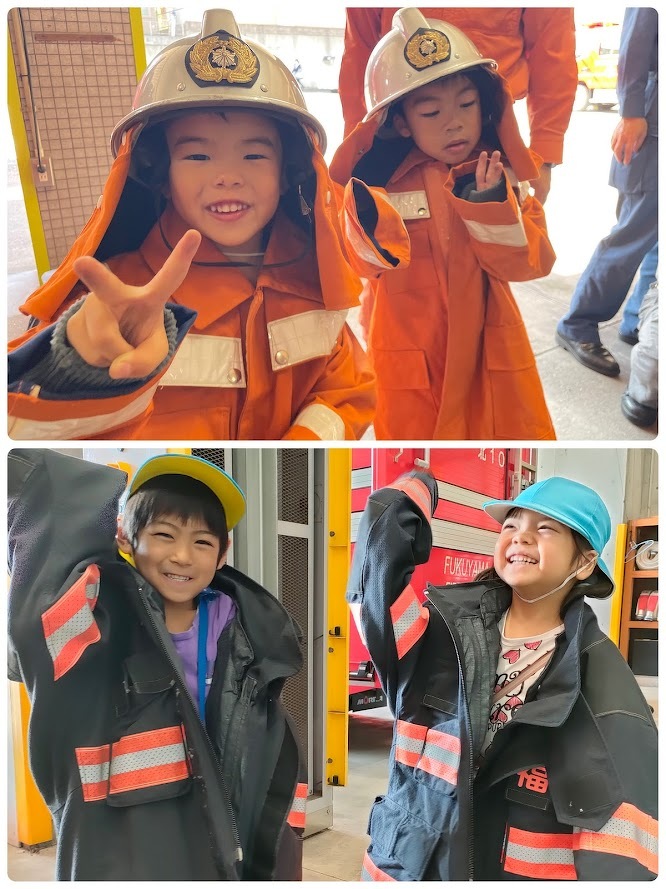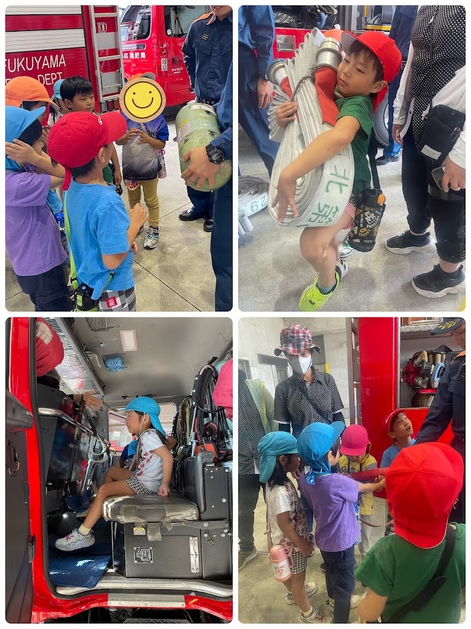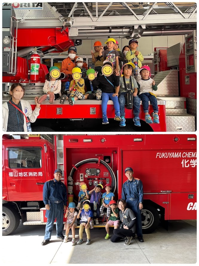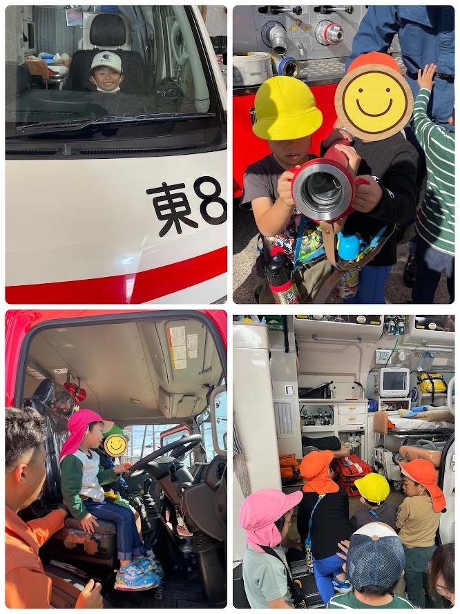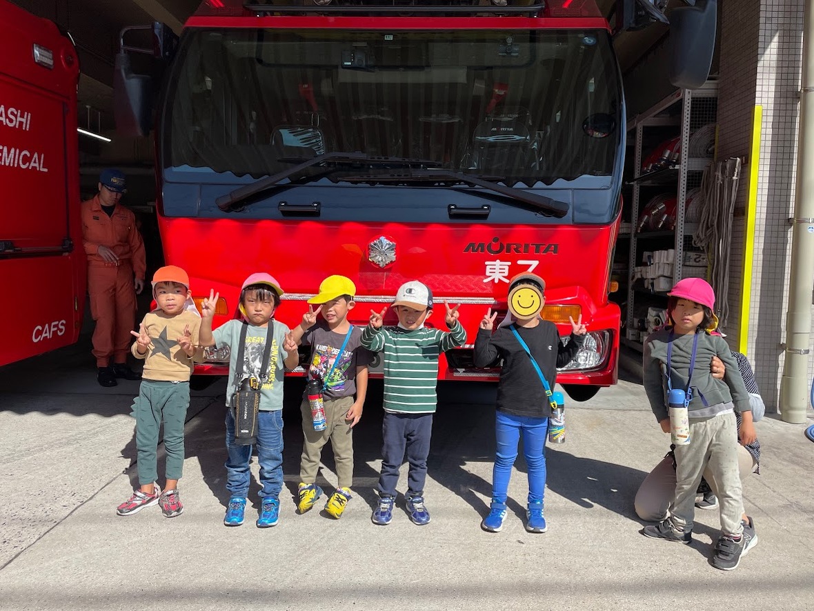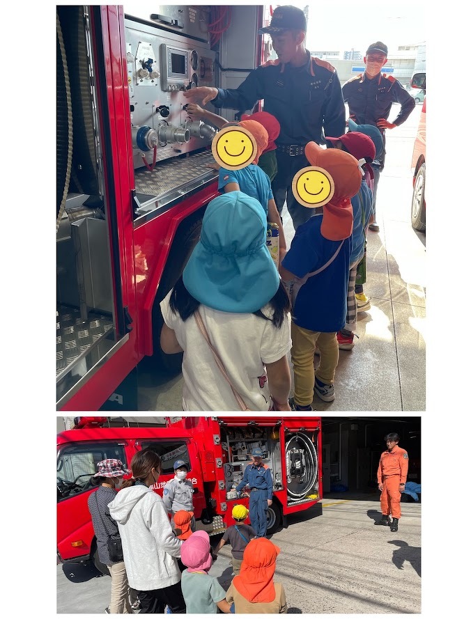 年長は北消防署、年中・年少は東消防署へ見学へ行ってきました。消防署に着くと消防車に興味津々な子どもたち!!!さっそく、消防車と救急車の話をしていもらいました。