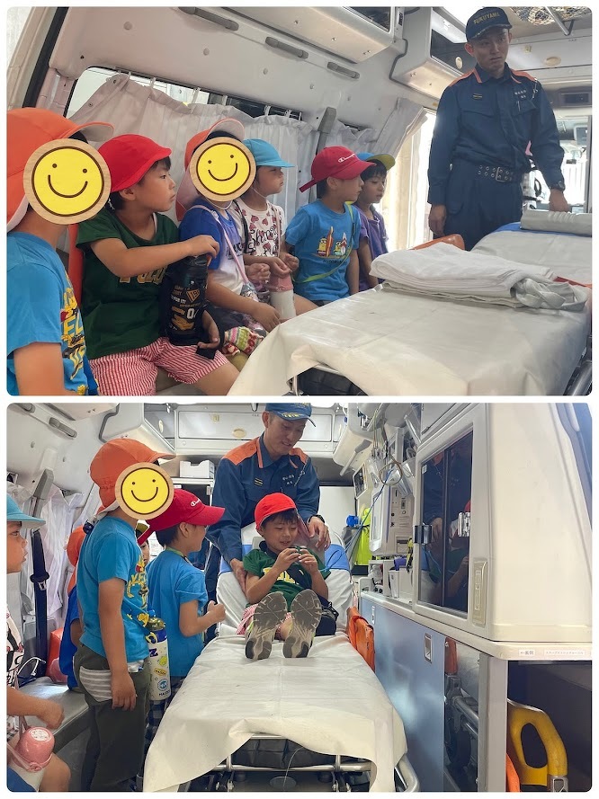 年長は、救急車の中も見学しました。「ストレッチャーの上に乗ってもいいよ」と声かけられましたが、みんな緊張していたのか「・・・」