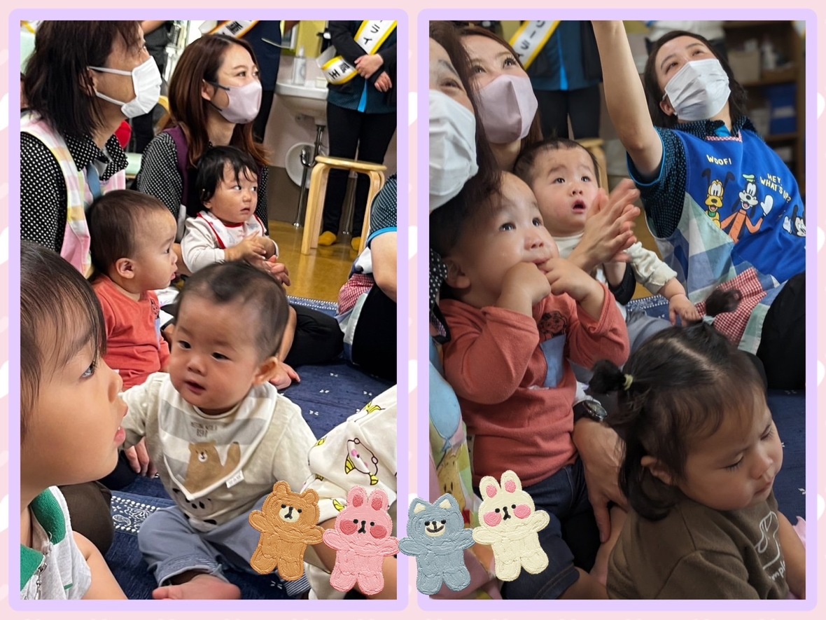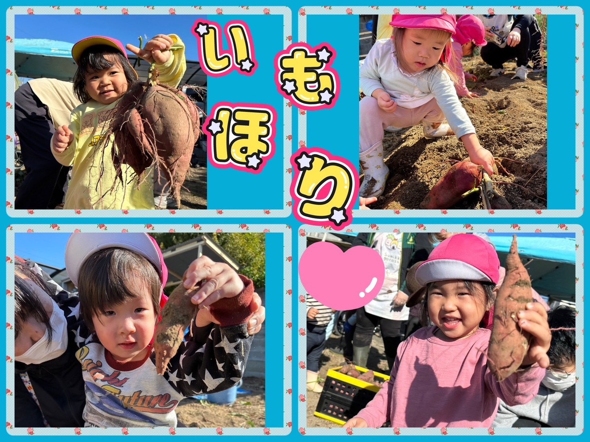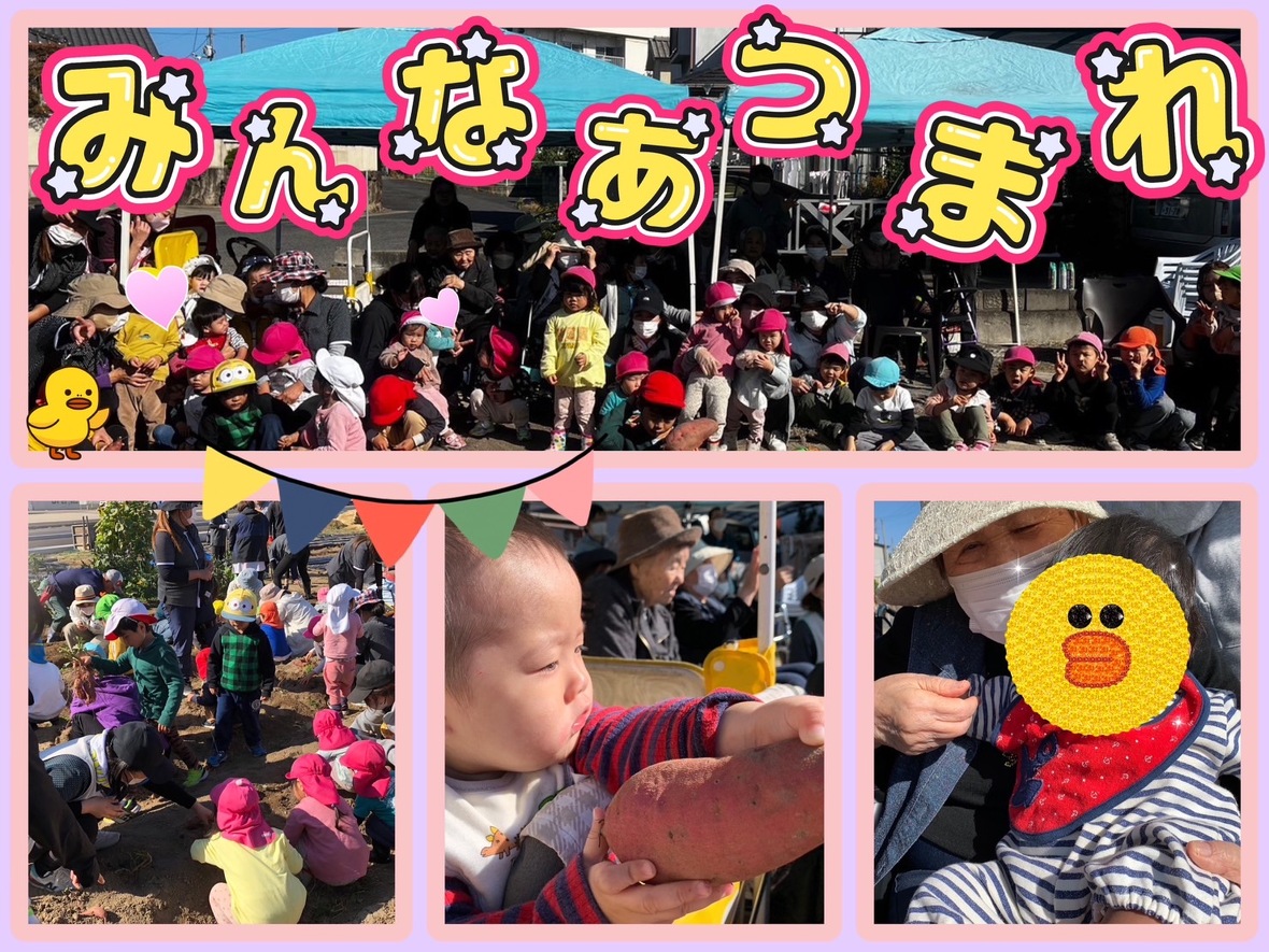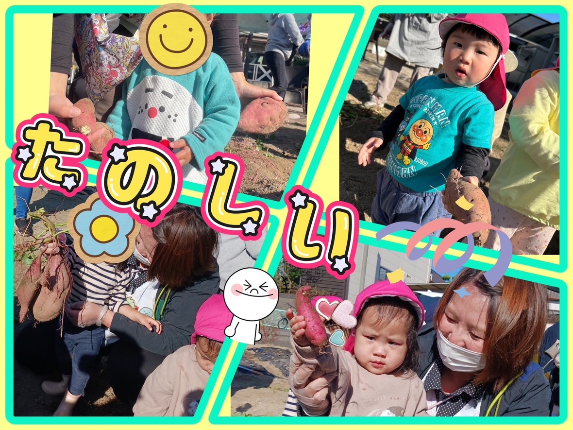 11月8日に芋掘りがありました。”わくわく”だけでなく”くららぼ””アイリーらぼ””のどか利用者さん””地域の方”と多くの人たちで楽しみました。みにととろぐみさんは、人の多さに少し戸惑っている姿でしたが、先輩のととろぐみさんは、ちょっと慣れた雰囲気で活動を楽しんでましたよ。さすが経験を積んでいる2歳さんはお芋の場所を教えてもらうと張り切って手で掘り始めました。今年の芋は、子どもの顔くらい大きい芋もあり,