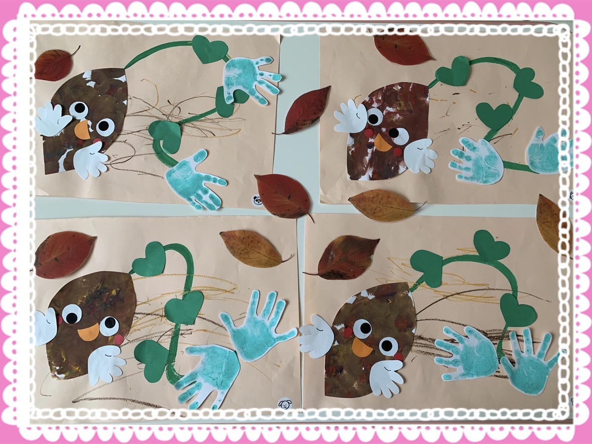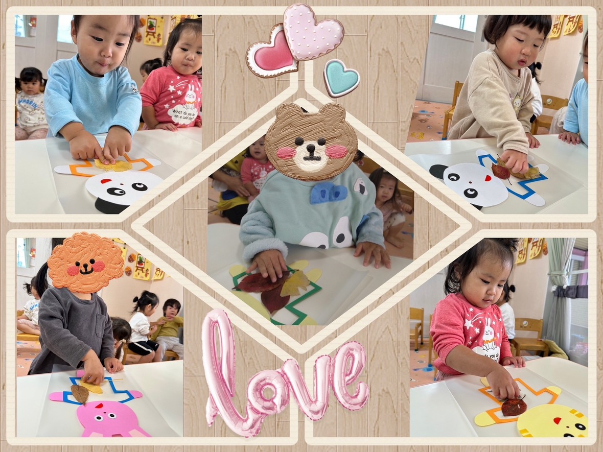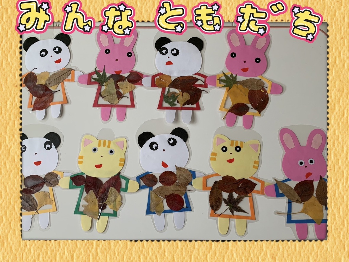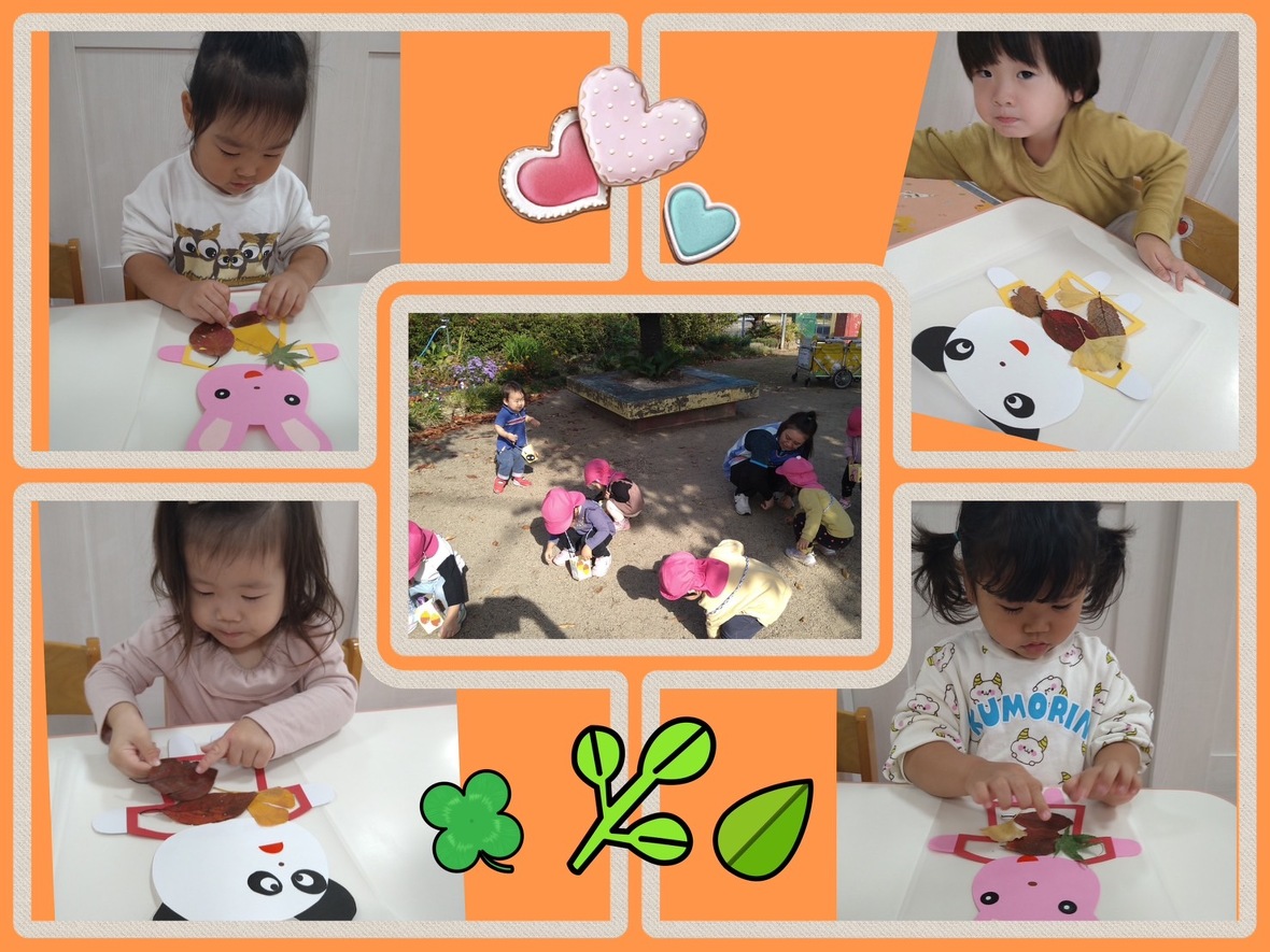そして、公園で落ち葉拾いを楽しみ洋服づくりをしましたよ。おしゃれなパンダ・うさぎ・ネコさんの出来上がりです。