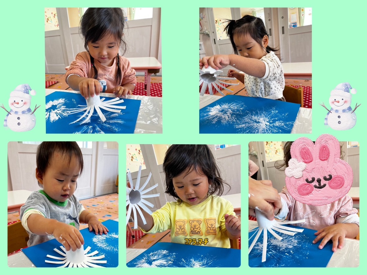 ととろ組さんでは、トイレットペーパーの芯の先を細く切ったものを使います。白の絵の具を付けて、青色の画用紙にトントントン!!!どんな形になるんだろうと思っていた子どもたちですが、、、何度か繰り返すとまんまる雪だるまの出来上がりです!!丸い形が出来上がってくると驚いたり、楽しそうな顔が印象的でした(*^^*)ぼうしに手袋、顔をはるとかわいい雪だるまの出来上がりです!!