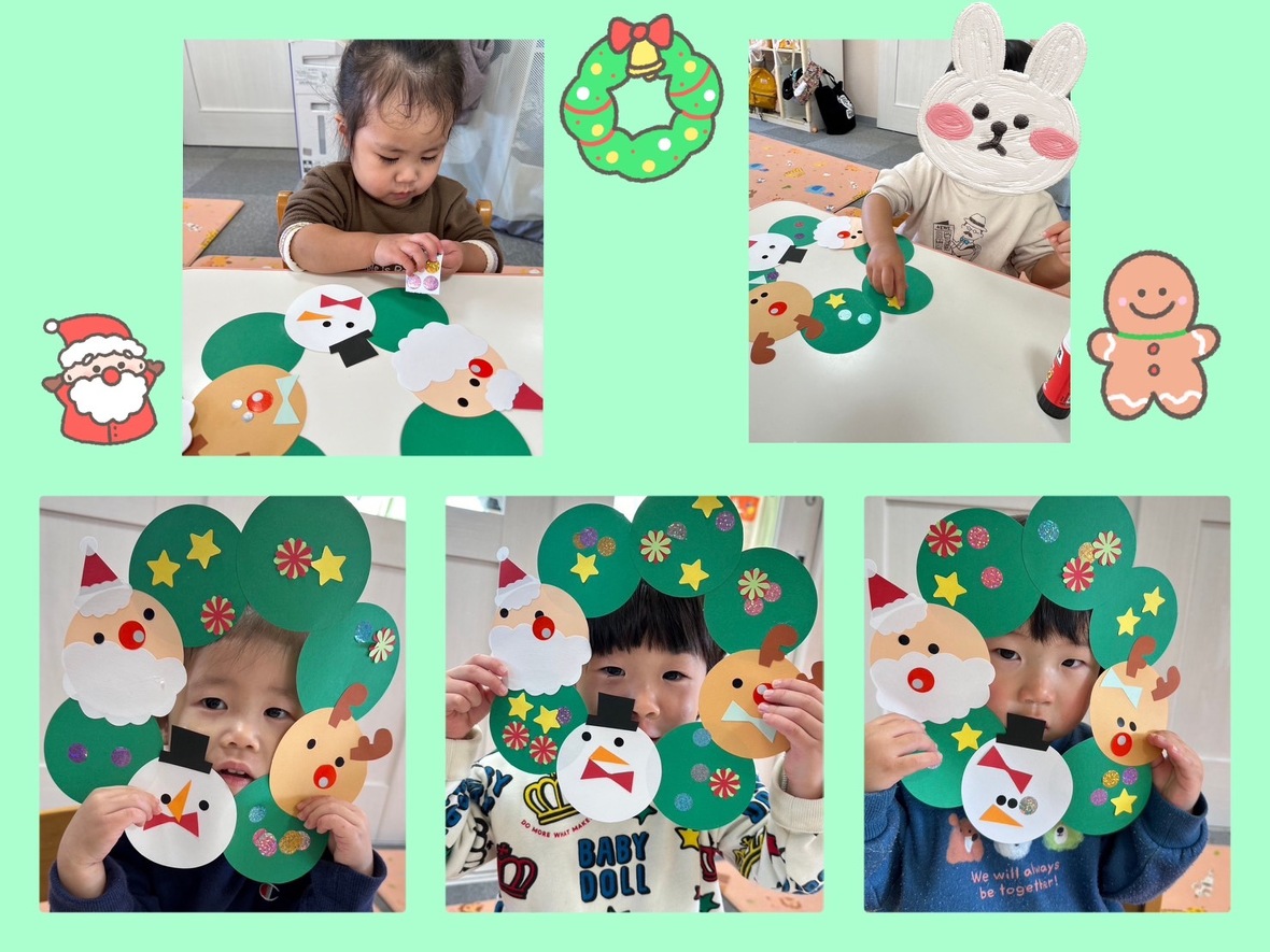 クリスマスリースも作りましたよ!サンタさん、トナカイさん、雪だるまの顔をシールで貼るとかわいいお顔になりました!!緑色のにはキラキラシールや星や雪の結晶を貼ると、かわいいリースの出来上がりです☆まるい穴を見るとついついのぞきたくなりますね(*^^*)
