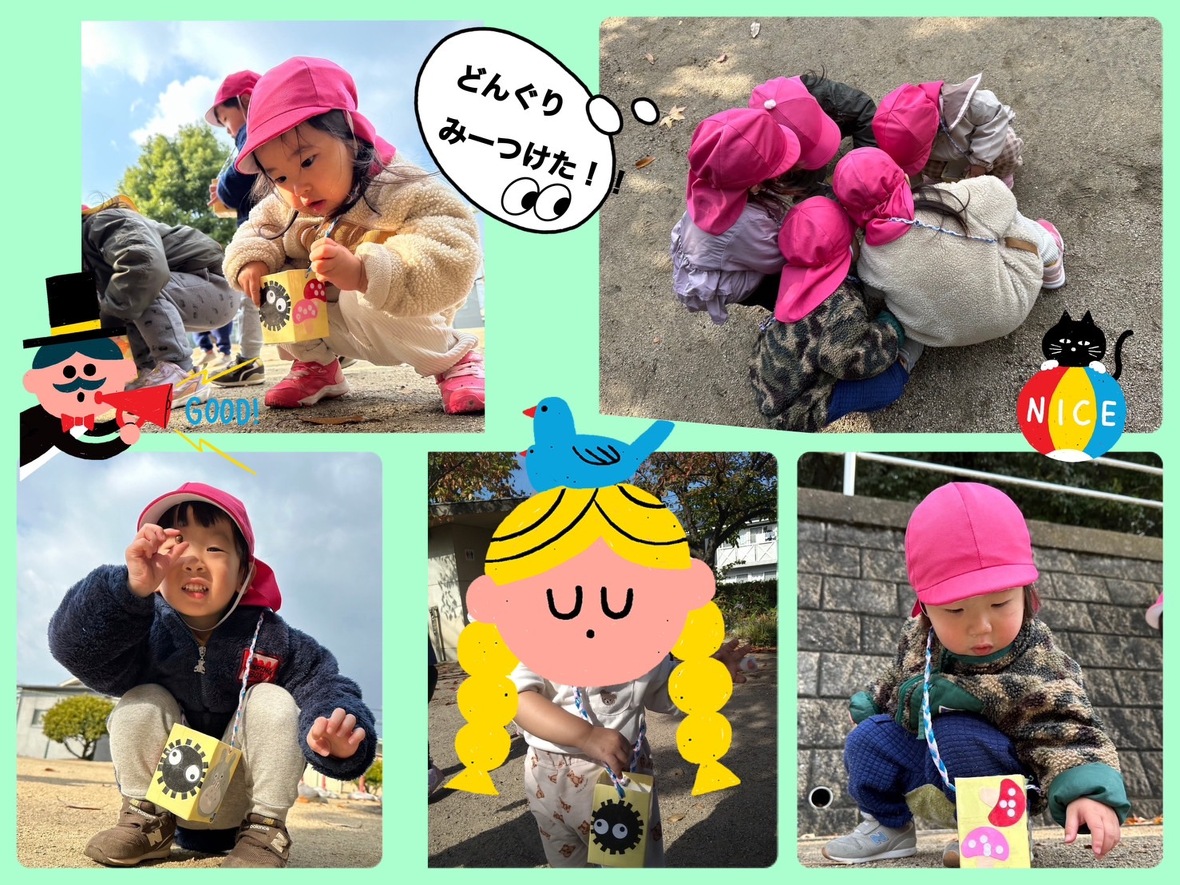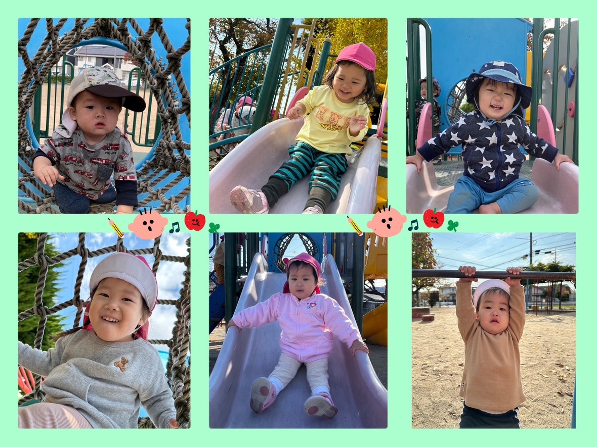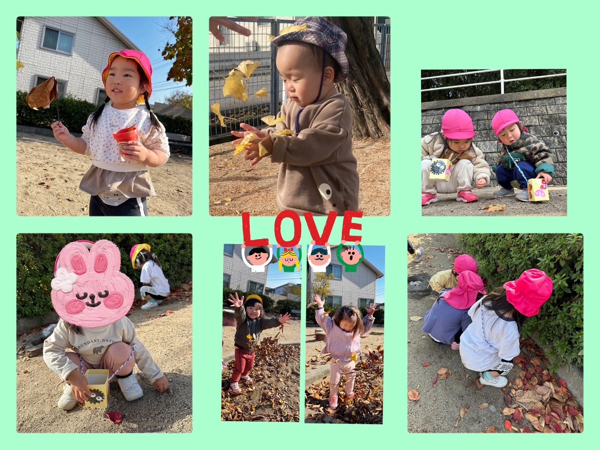 お天気のいい日は公園で遊んだり、秋を探しに出かけています!!すべり台やアスレチックロープが大好きな子どもたち!楽しくてみんな笑顔になります(*^^*)公園には落ち葉やどんぐりがいっぱい落ちていて、宝探しのようです!みんな仲良く同じ場所で探していて、微笑ましくなります♡