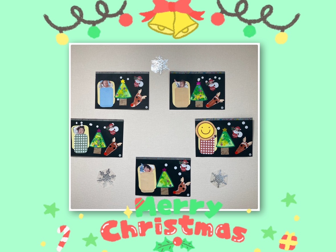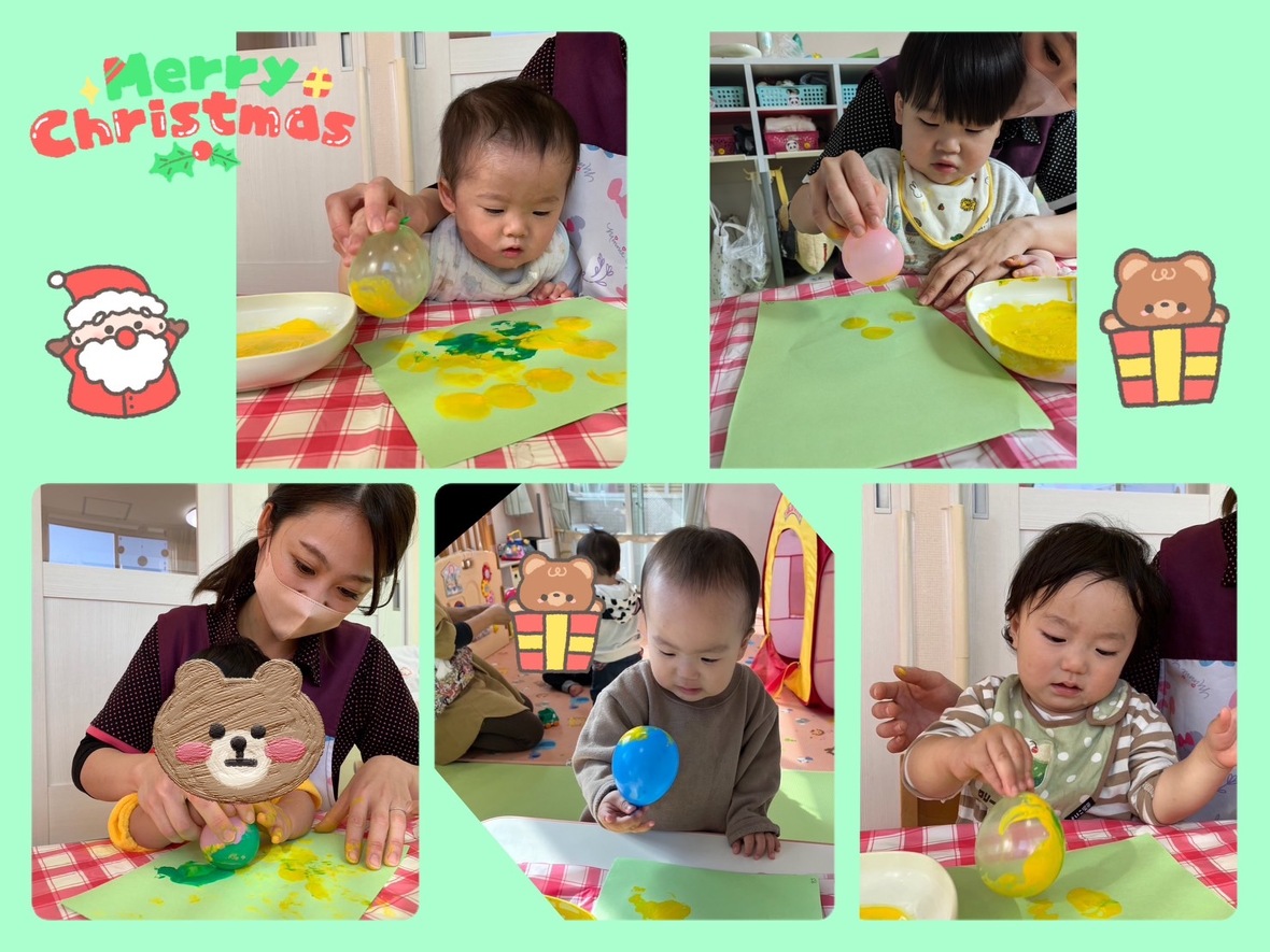 みにととろ組さんは、風船を使いましたよ!!風船に二色の絵の具をつけて、黄緑色の画用紙にポンポンポン!!!風船の弾力を楽しみました。模様が出来上がるとなんだろうと画用紙をのぞきこんでいる姿がかわいかったです♡子どもたちがポンポン模様をつけた画用紙は、ツリーになりました。かわいい足型のトナカイさんと、ステキなサンタさん、そしてかわいいみにととろ組さんの寝顔♡♡♡お部屋の中がクリスマスになりました。