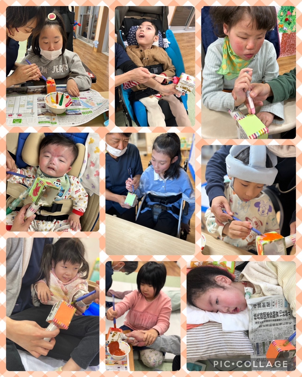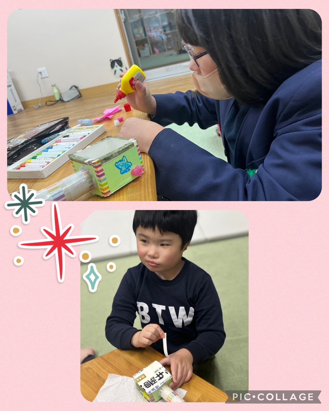 牛乳パックとサランラップの芯でマラカスを作り、みんなで色を付けました。