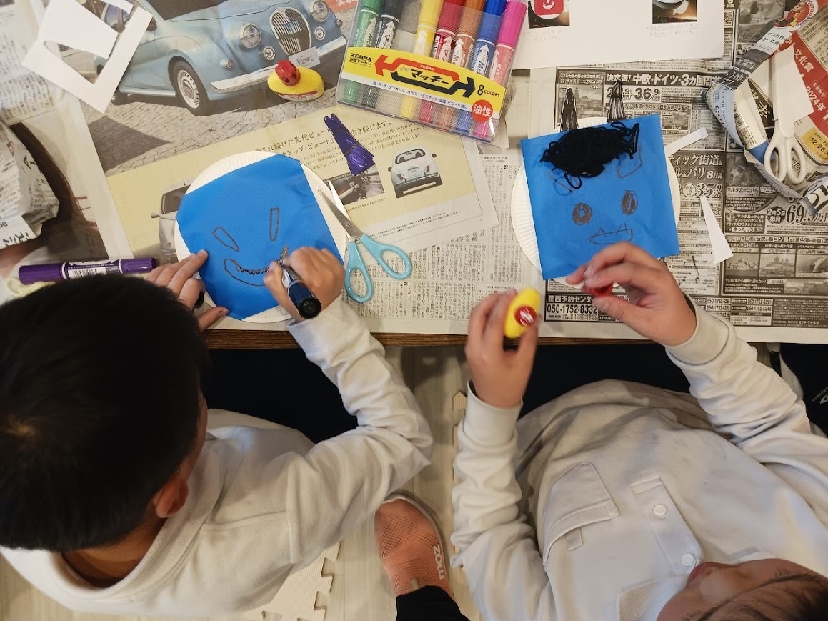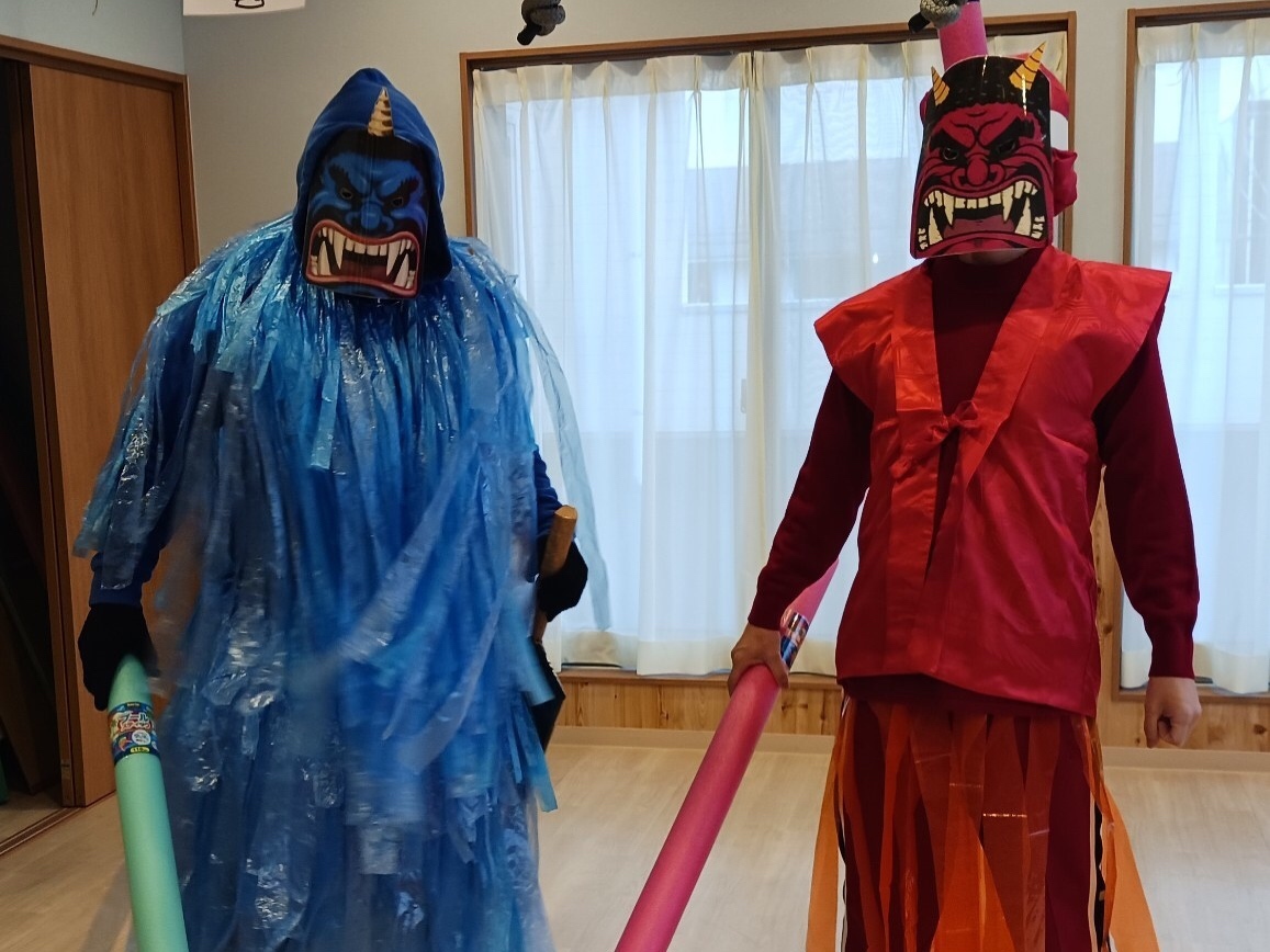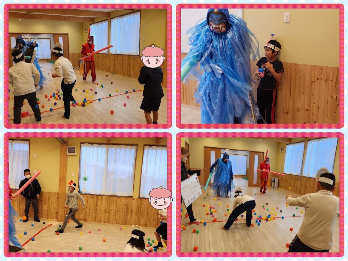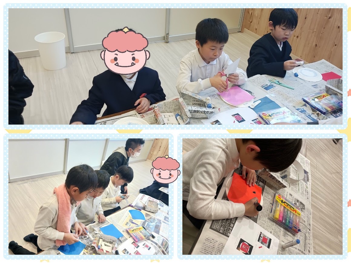 2024年02月08日(木) 活動ブログ 節分★鬼は外~福は内~ こんにちは。アイリー・らぼ放デイです。 2月に入りましたね。2月と言えば節分ですね。らぼでも節分にちなんで制作で鬼のお面を作りました。 みんな自分の思い描く鬼を描いたり色を塗ったりしていました。 完成するとそのお面をかぶって鬼退治をしました。 鬼も子ども達に負けないように頑張っていました。 鬼役の先生たちも頑張りました。