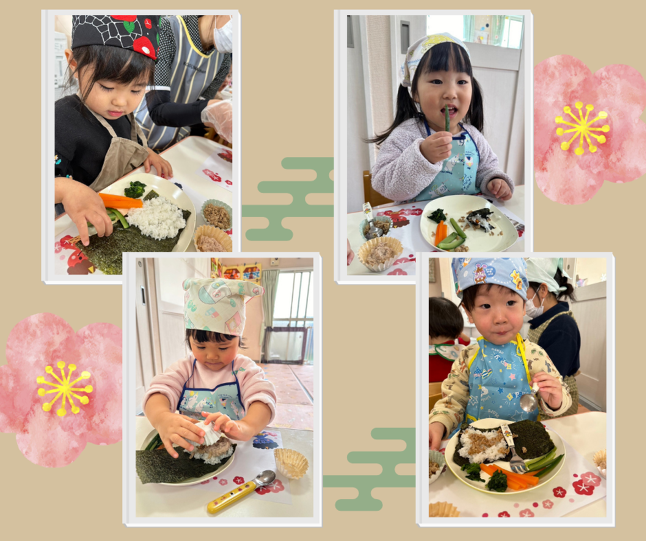 2歳児さんは給食の時に恵方巻き作りをしました。自分で好きな具材を入れて巻き巻き。子どもたちは「自分で作った」というのが嬉しくてたくさん食べていました。