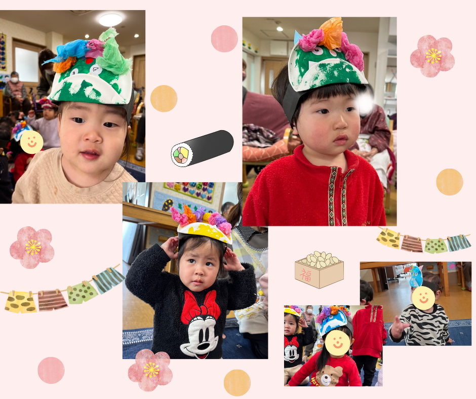 2月3日は節分でした。わくわくキッズでも、のどか南のおじいちゃんおばあちゃんと一緒に節分会をしました。まずは、「節分ってどんな日?」「節分といえば何食べる?」などのクイズをみんなでして盛り上がりました。その後は、鬼と福の神の登場!鬼が怖くて涙が出る子・先生から離れられない子・全く動じることなくいつも通りの子…子どもたちはそれぞれの反応でした。怖がりながらも頑張って豆を投げてみんなで鬼退治をしました。