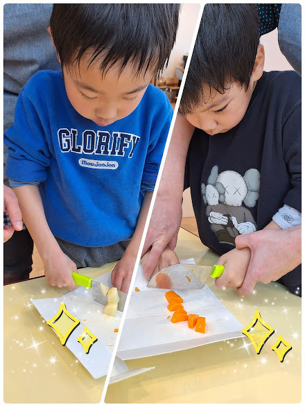 始める前に猫の手の練習をしたり、包丁の持ち方を確認したりしながら、野菜切りにチャレンジしましたよ☆