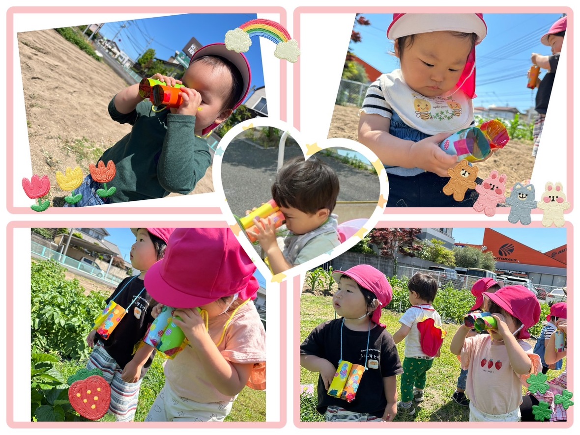 好きな色を選び、双眼鏡の周りには皆が好きなシール貼りをして、自分だけの双眼鏡を作りましたよ♫望遠鏡を持って、いざお散歩へ!近くをのぞき込んで見たり、遠くを見たり、それぞれ楽しみました。双眼鏡の先にはいろいろな色のカラーポリを貼っているので、いつもと違う景色や色も楽しみましたよ♫