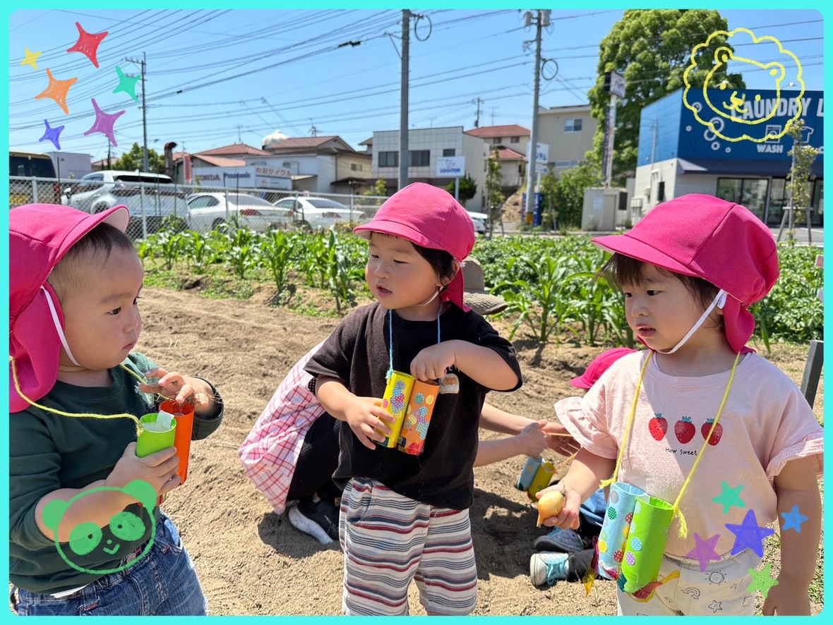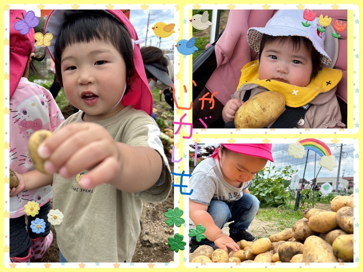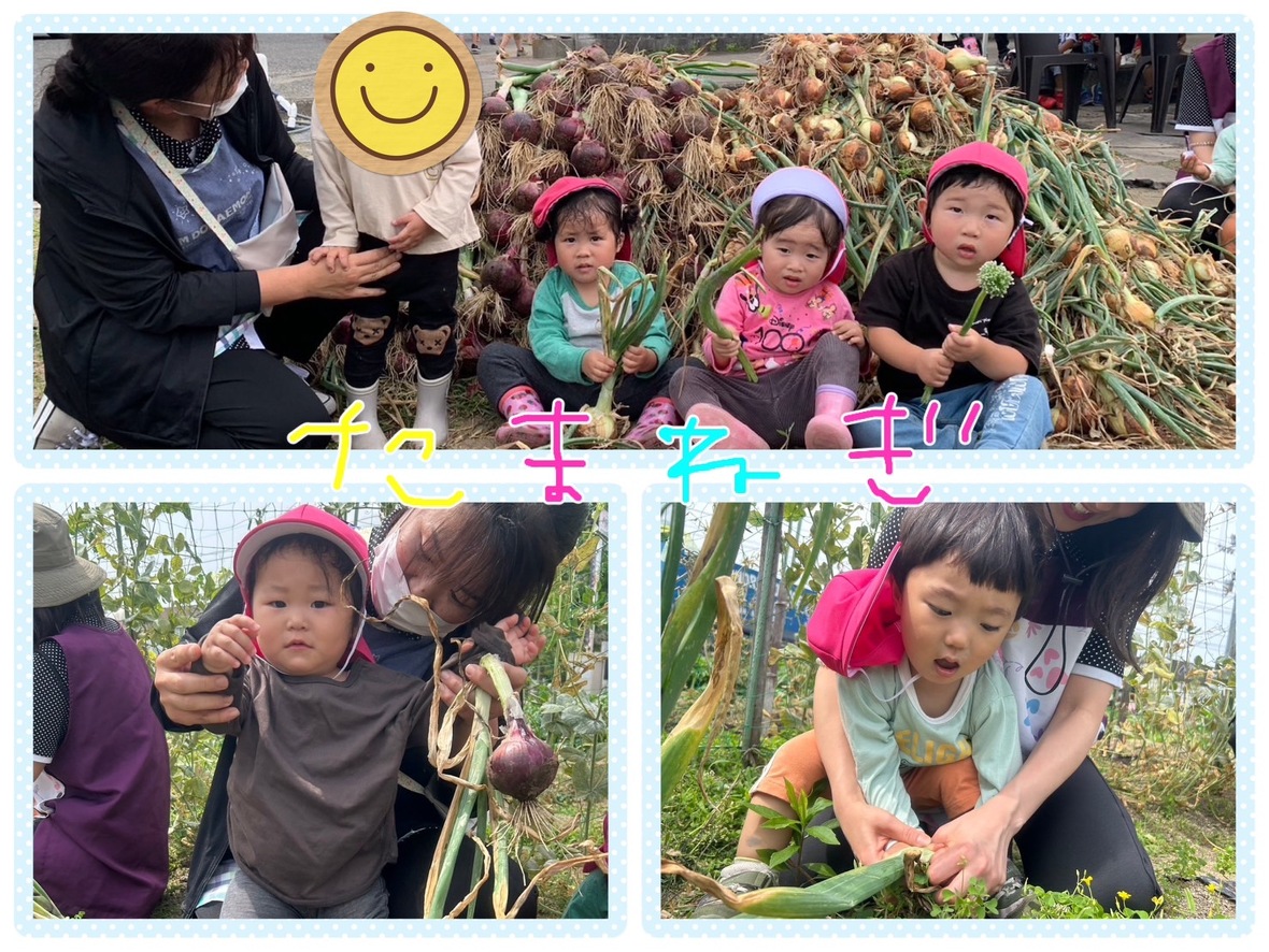 6月は、玉ねぎに、じゃがいもにたくさん野菜を収穫しました。一生懸命に玉ねぎを収穫した後に手を匂ってみると玉ねぎの美味しい匂いになっていたり、じゃがいもは皆の顔くらい大きなものだったり、皆の指くらいの小さなものだったり、大きさも楽しみました。
