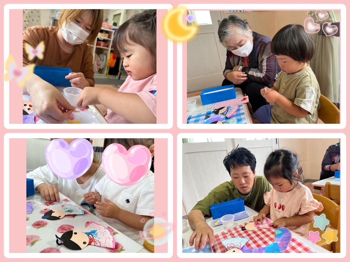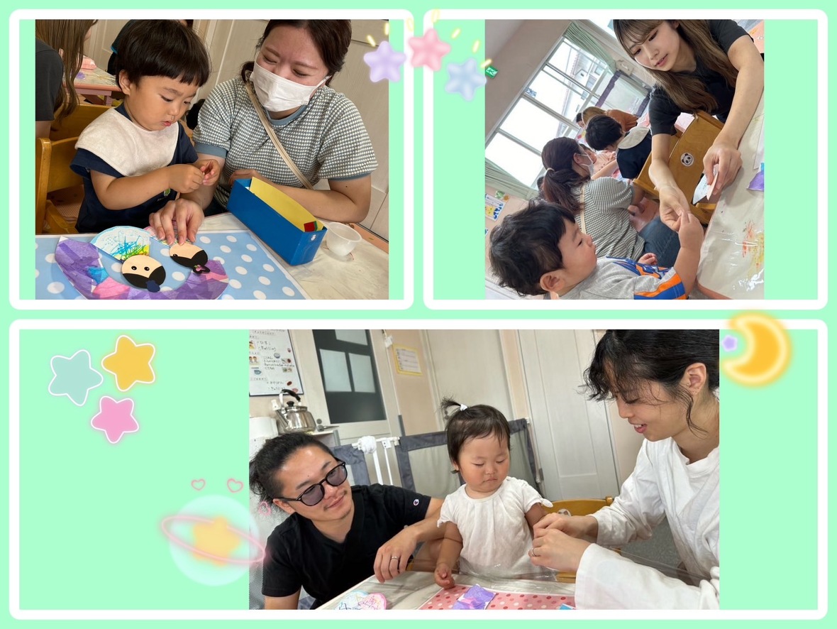 大好きなお家の方と一緒に参観日で制作遊びをしました。いつもと違う雰囲気で少し緊張気味な様子でしたが、少しずつ和らいできて、頑張っている姿や楽しんでいる姿をたくさん見てもらうことが出来ました。今回は七夕の制作を作りました。しっかりお願い事も込めて作りましたよ☆
