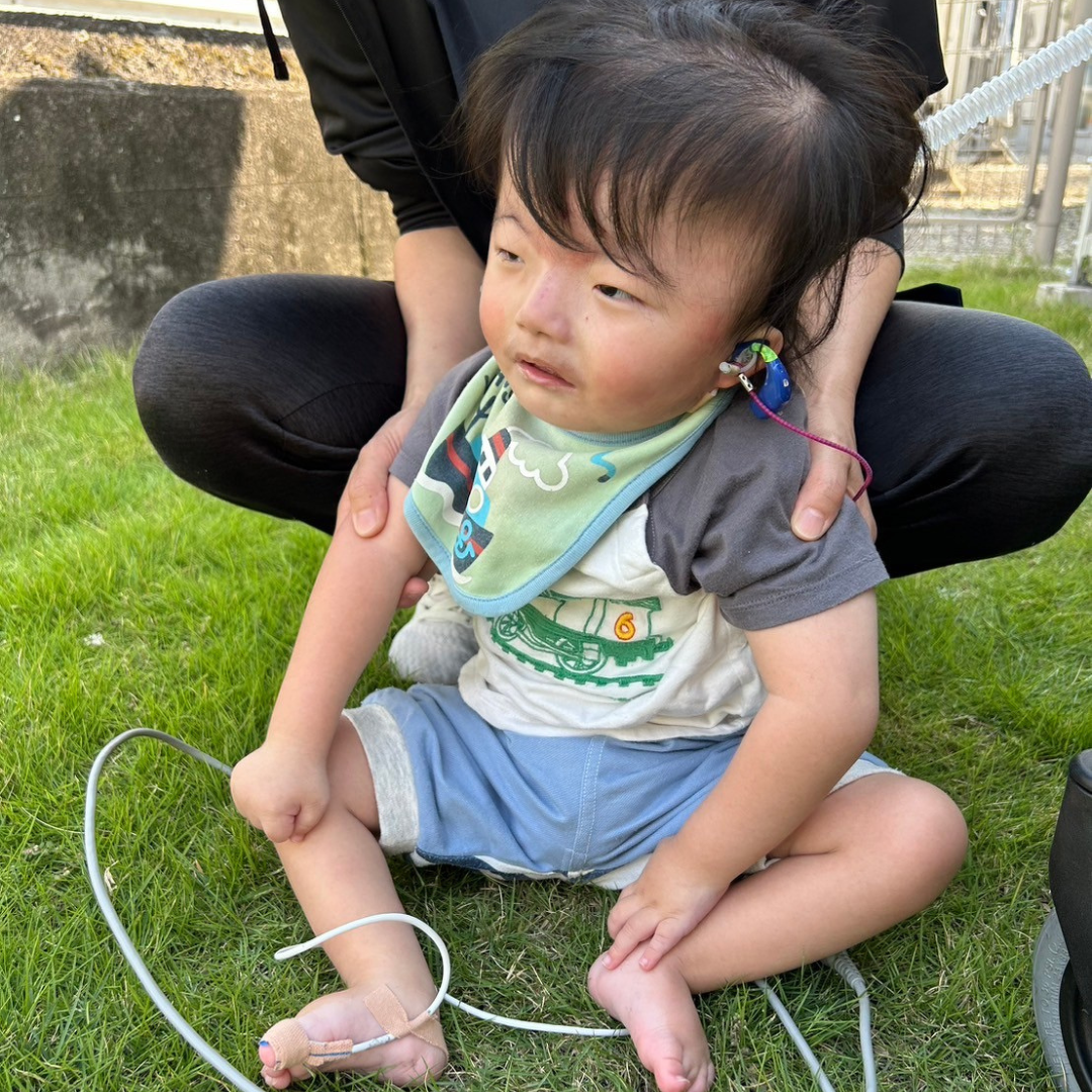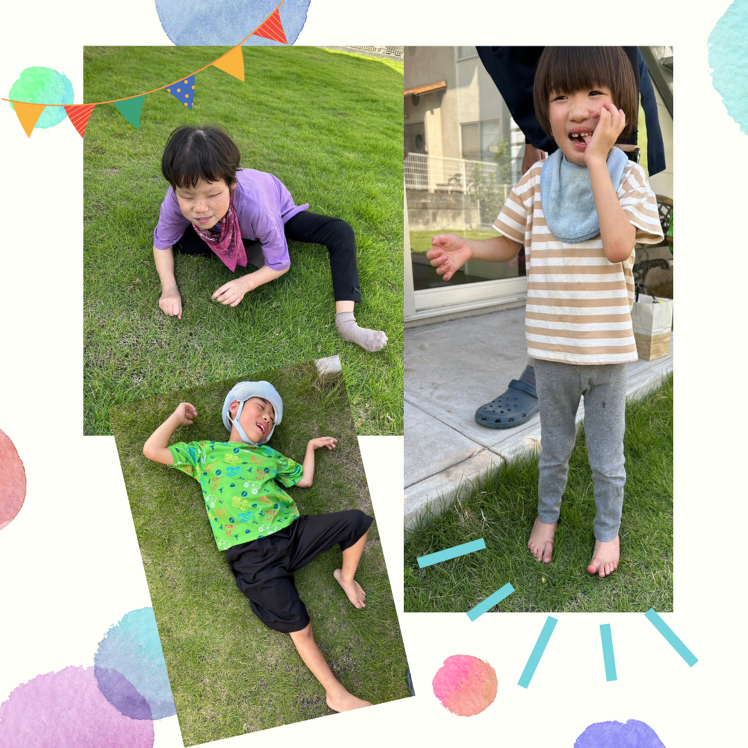 いつも重心の子ども達は靴を履いて遊んでいるんですが、今回芝生の感触をしっかり味わってもらおうと裸足になって歩いてみました。