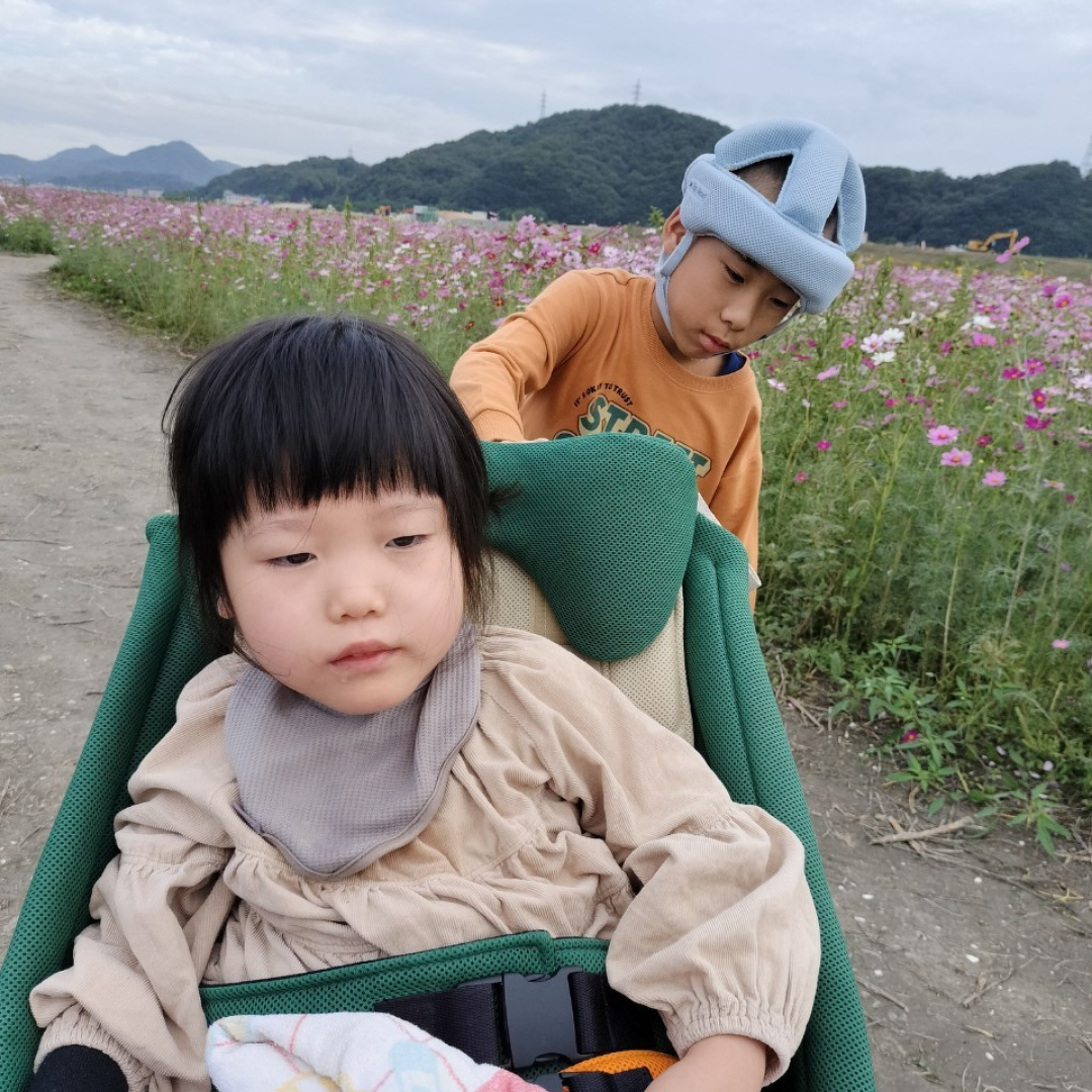 お友達のバギーを押してくれる優しい場面も見れて、キレイなコスモス畑にたどり着きました。