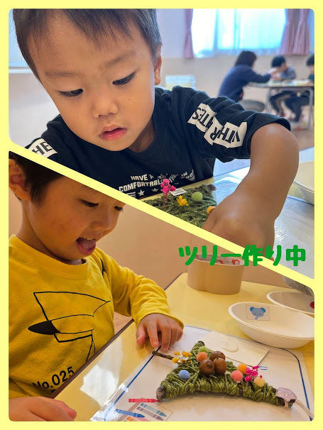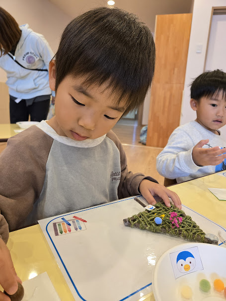 木の枝に毛糸を巻き付けたツリーの土台にお花やポンポンそしてみんなで拾って来たどんぐりを「どこにつけようかな?」「ポンポンはどうしようか?」と考えながら小さいパーツを指先を使ってボンドでしっかり固定。