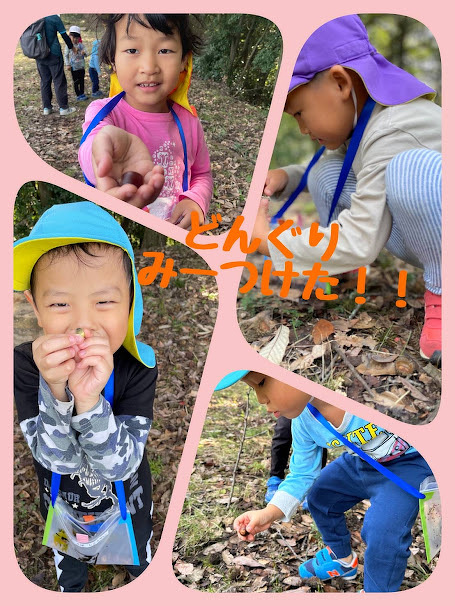 まず、吉野山へ山登りをし、ツリーの飾りに使うどんぐりを集めました。山道を歩くのは、土がボコボコしていたりどんぐりに滑って転びそうになったりとちょっと進むだけでも大変だったけどたくさんのどんぐりが落ちている様子にみんな目をキラキラさせて夢中に拾っていましたよ。