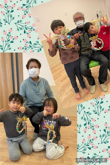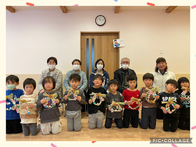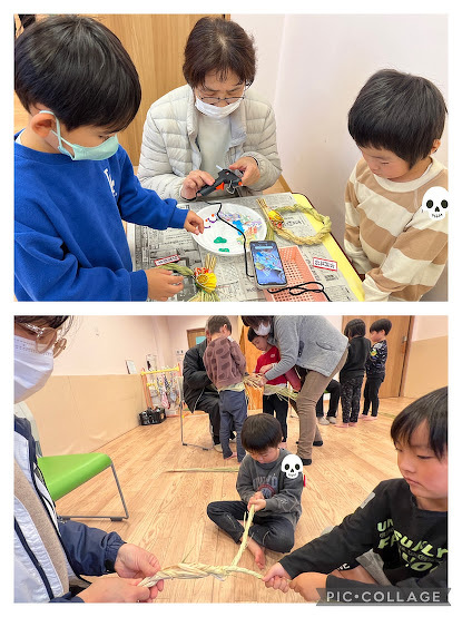 また、別の日には開所以来の恒例行事となっている「しめ縄づくり」があり、年長さんが参加しました。