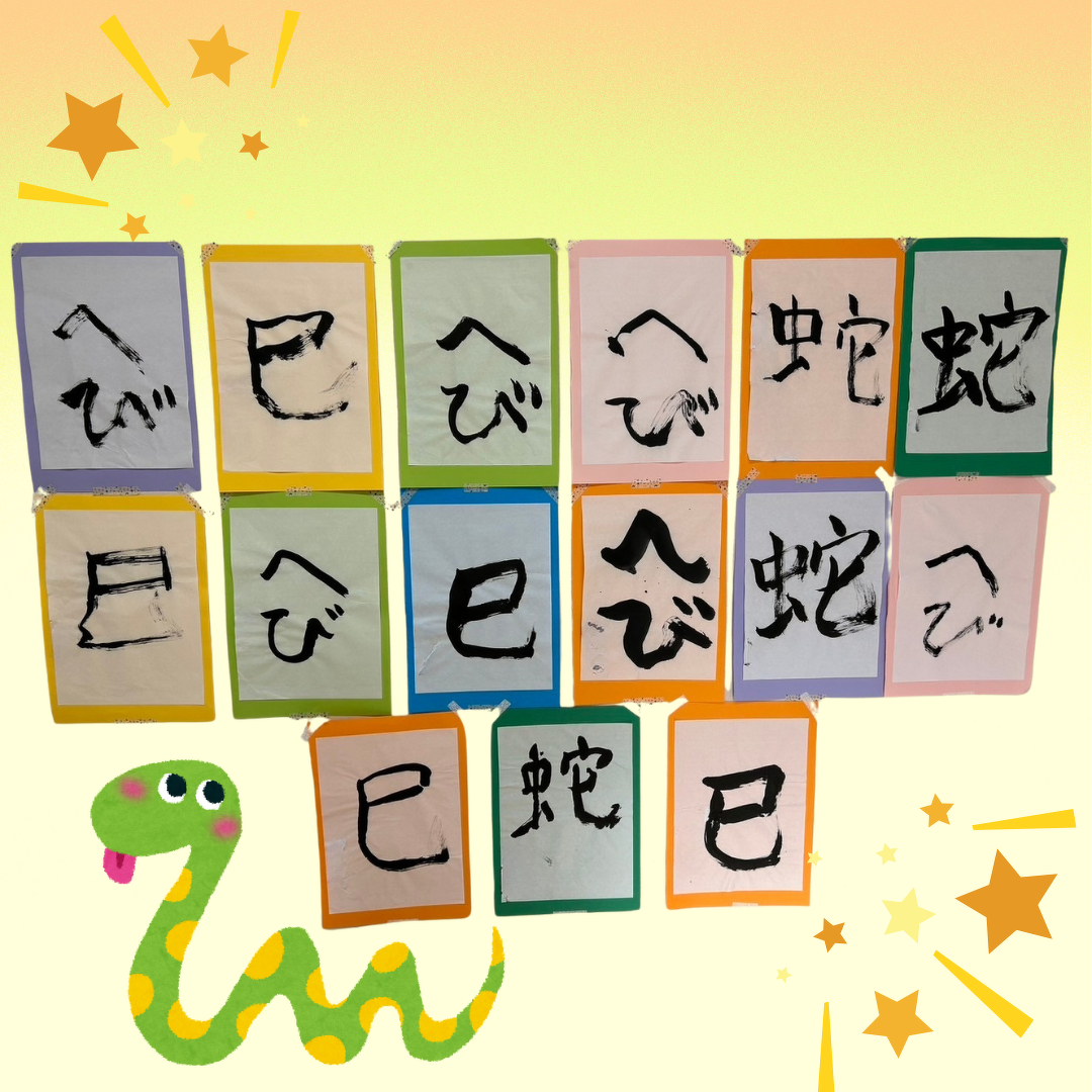 本物のへびのような曲線で書いている子もいて、重心の壁に華やかに飾られています。
