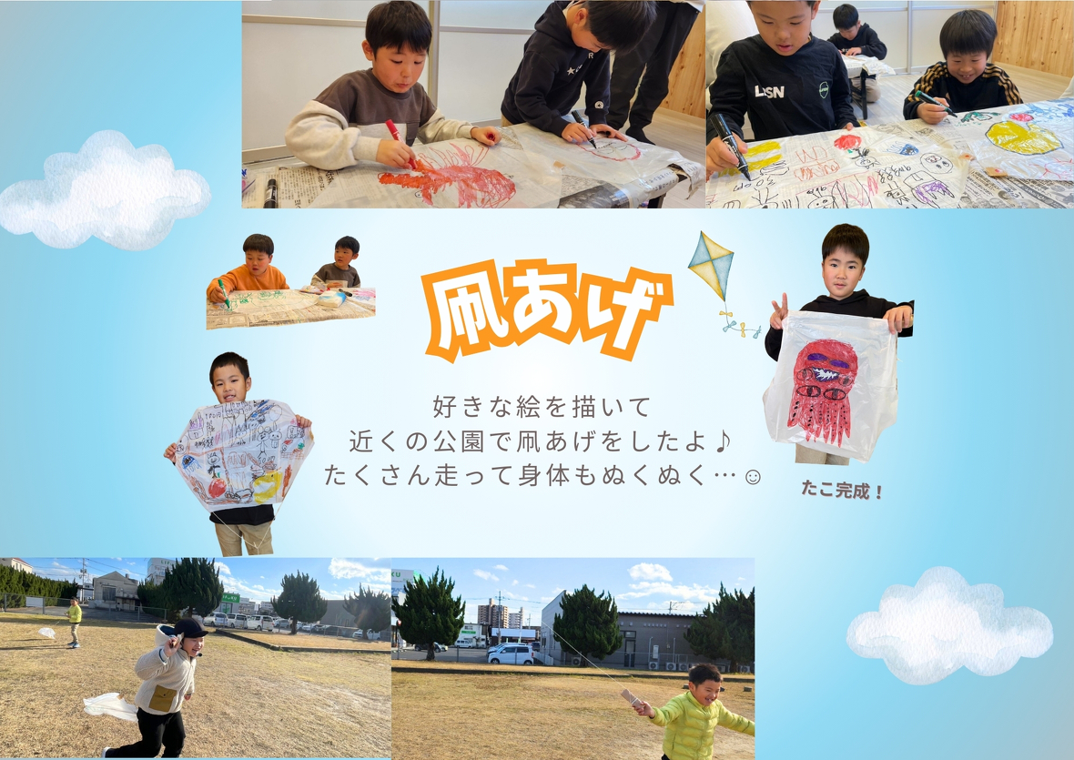 凧あげづくりでは、自分の好きな絵を描いて作り近くの公園で凧あげをしました!