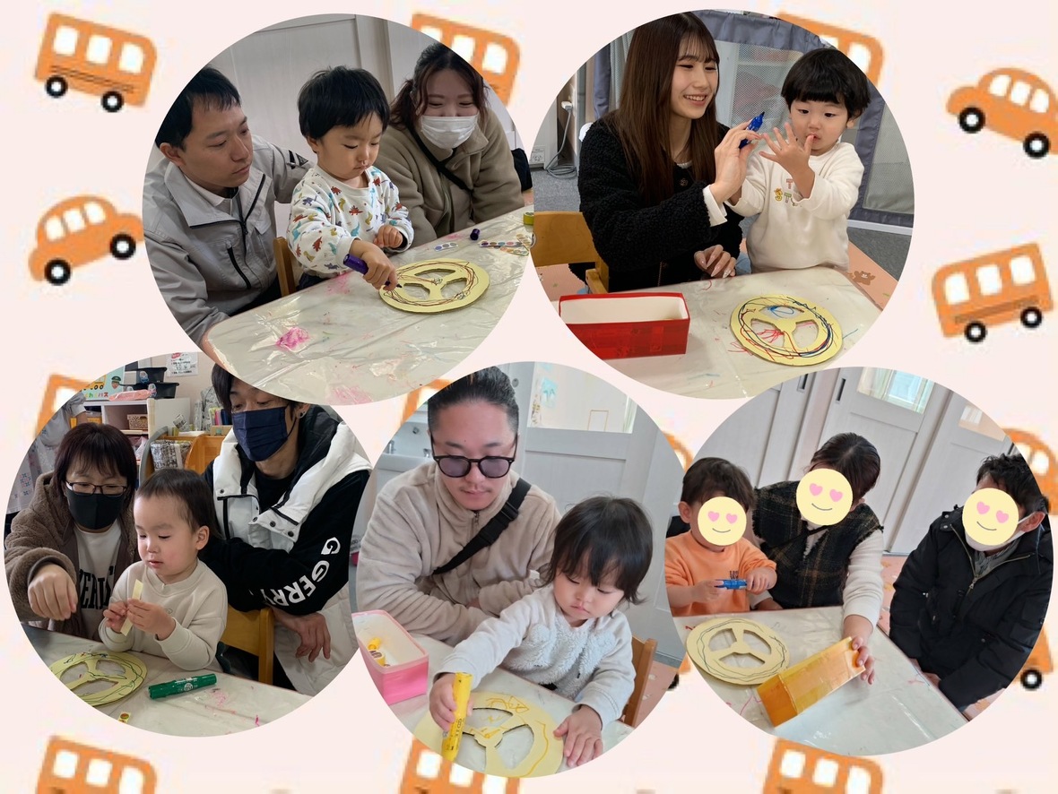 お父さんとお母さんと一緒に、ペンで描いたりシールを貼ったりしてハンドルを作りました!