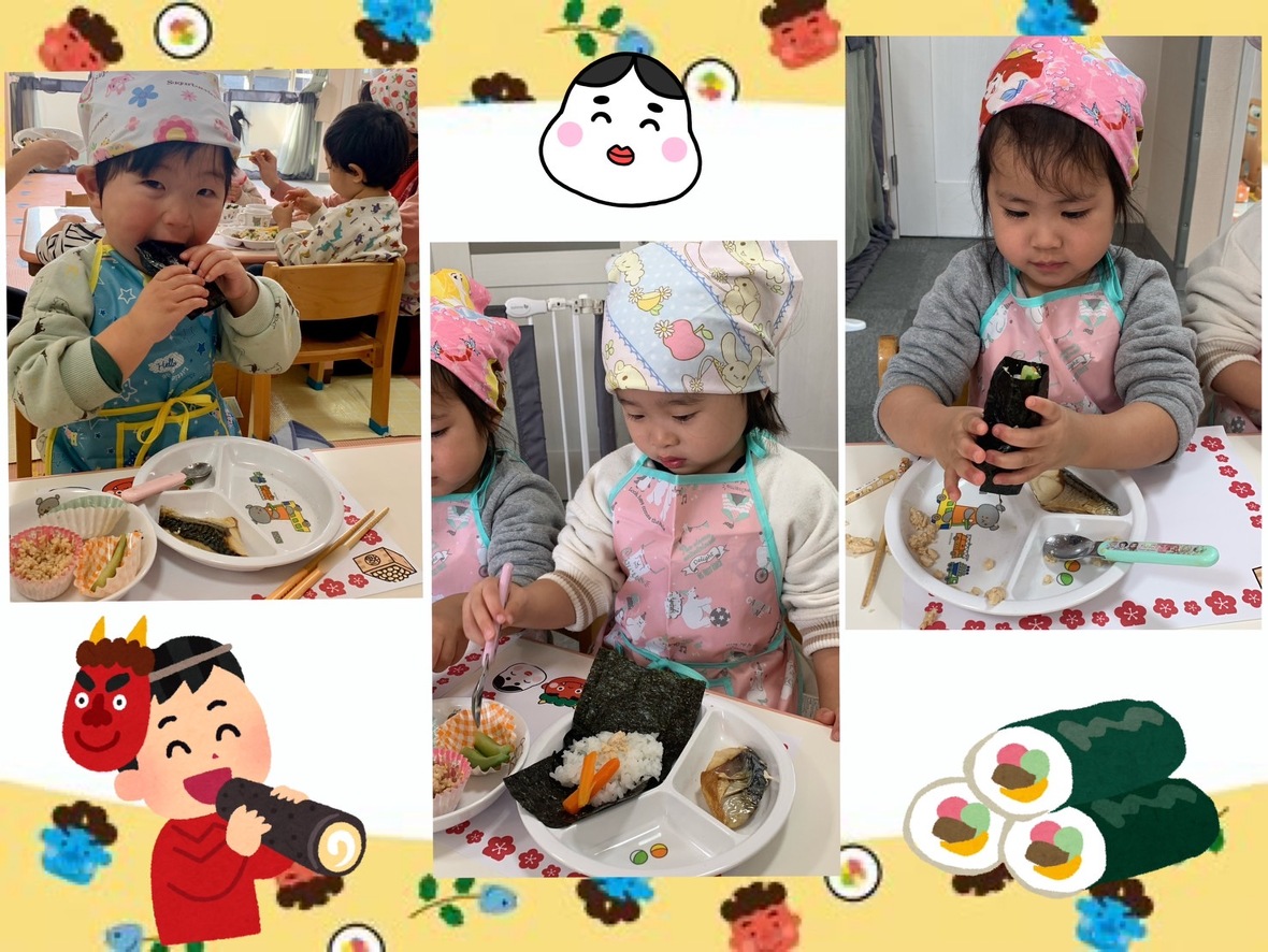 節分会を終えて、2歳児さんはクッキングで手巻き寿司(恵方巻き)を作りました☆