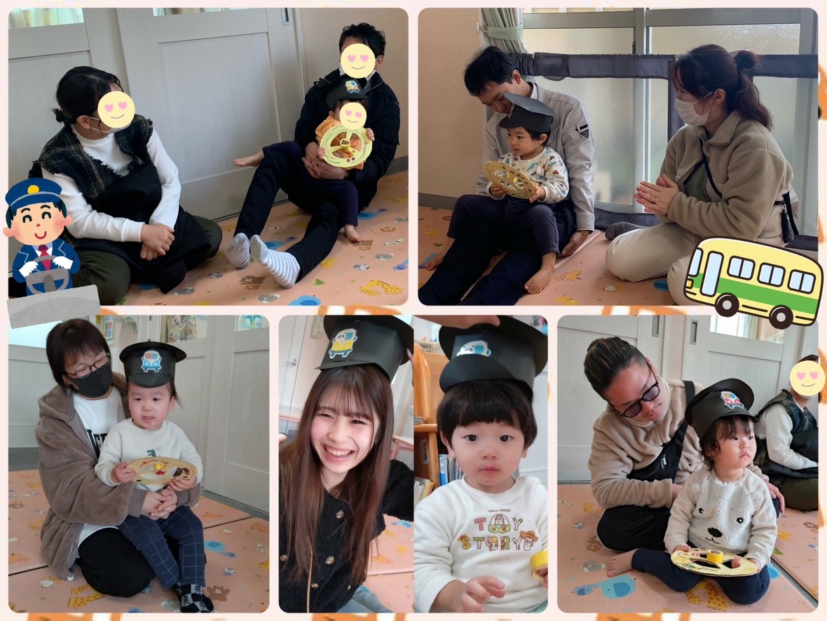 お父さんお母さんのお膝に乗って、「バスにのって」の音楽に合わせてふれあい遊びを楽しみました♪