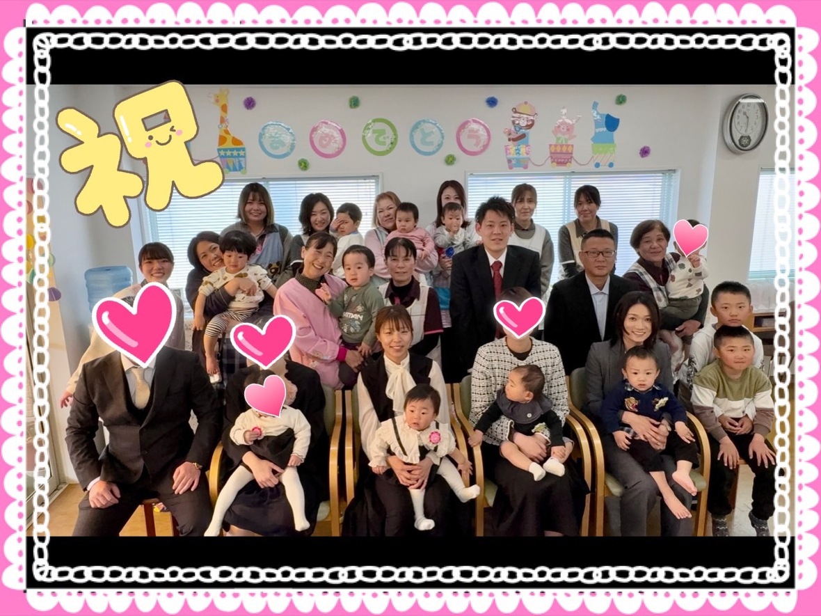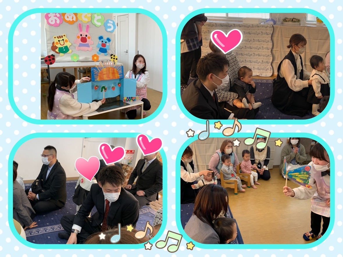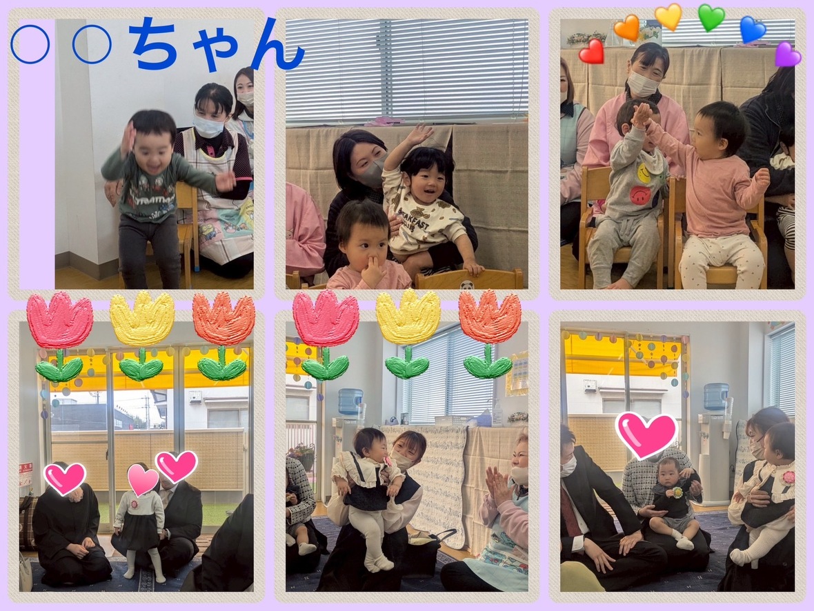 「おめでとうございます」とお祝いの言葉があり職員紹介を終えた後、子どもたちの名前を♪〇〇ちゃんどこでしょう♪の曲に合わせて呼びました。みんな嬉しそうに「はーい♡」と手を挙げていました。