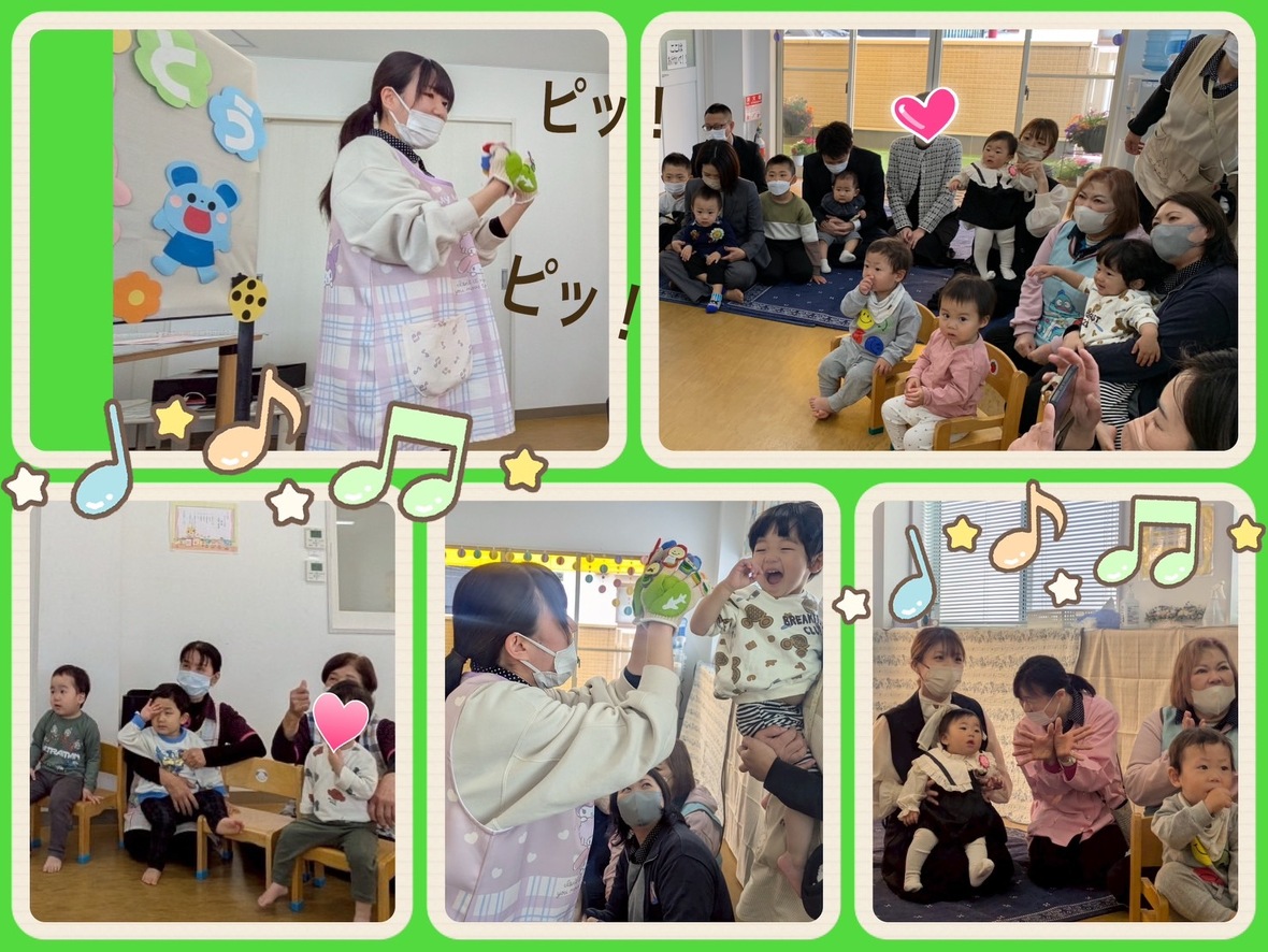 その後もみんなが好きなボックスシアター『はらぺこあおむし』を楽しみました。あおむしになったつもりで一緒にパクパク食べている子どもの姿が見られ可愛らしくてたまらなかったです。新しい友だちも真剣にみていましたよ。あおむしがちょうちょに変身するとみんなの顔が、満面の笑みに変わりました。