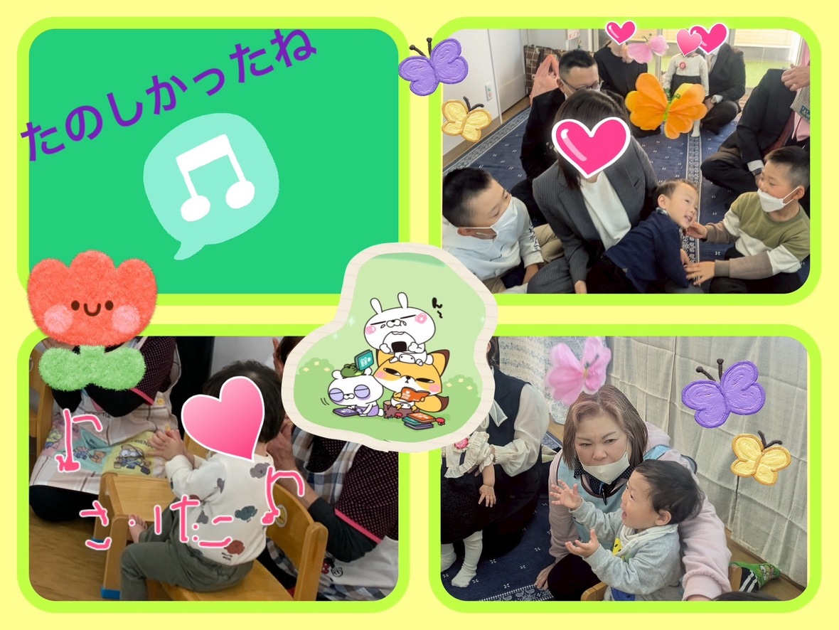 みんなで「ちゅうりっぷ」や「ちょうちょ」の歌をうたいました。”ちょうちょ”が目の前に来ると、みんな笑顔になってましたね。