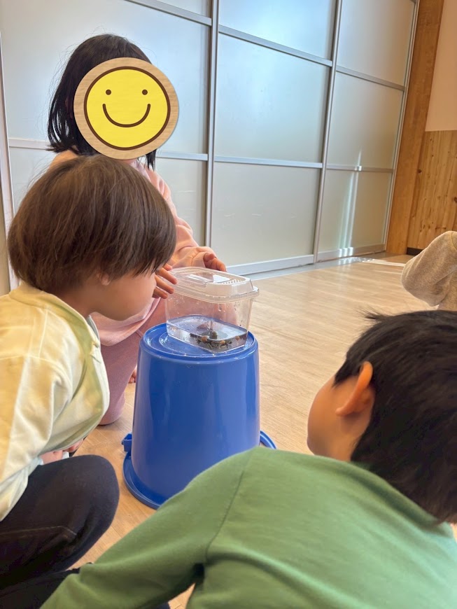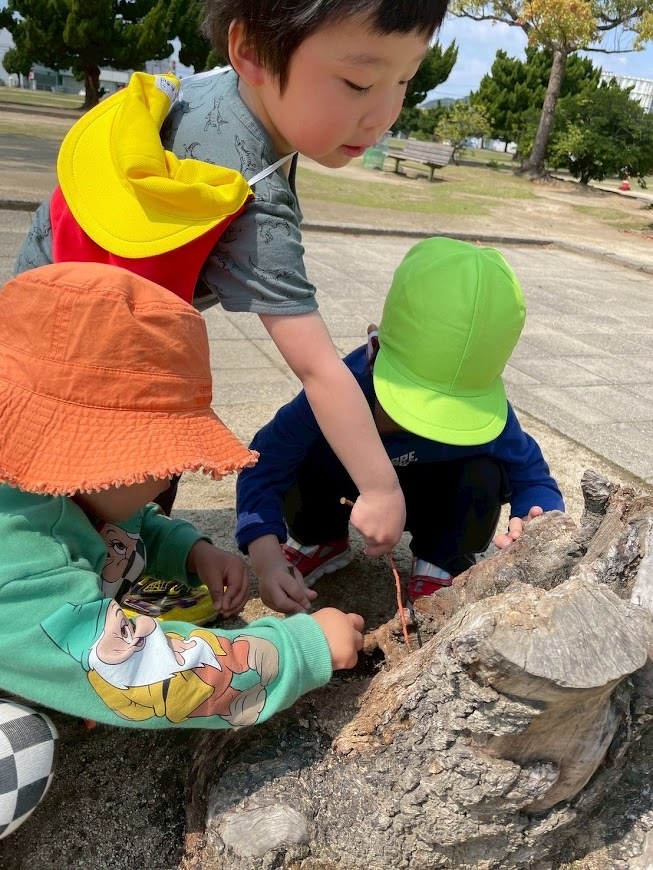 気候もよくなってきたので、近くの公園行き遊具で遊んだりダンゴムシ探しをしました。お友だちと一緒に落ち葉を集めてきて、焼き芋ごっこしている子いましたよ。木の実を焼き芋に見たてて「焼き芋できたよ」と持ってきてくれた姿が可愛かったです♡