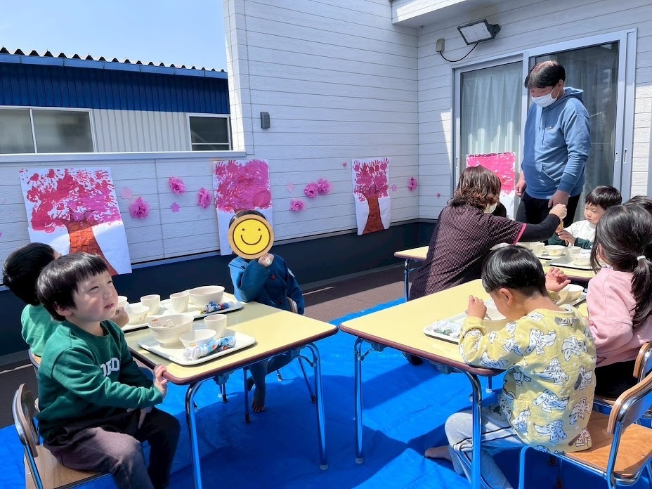 天気のいい日は、テラスで給食を食べました。花見気分を感じられるように、手形で作った桜で装飾しました。いつもと違う雰囲気だったのでパクパク給食も進んでいましたよ!!