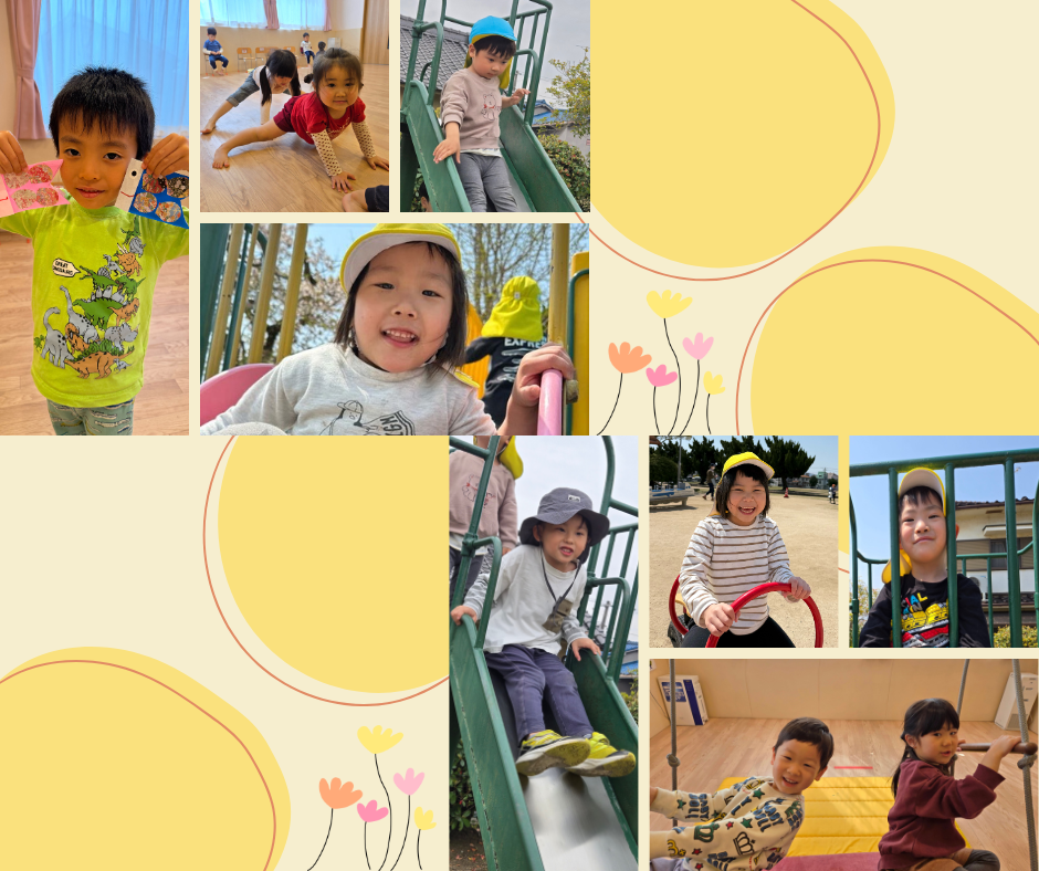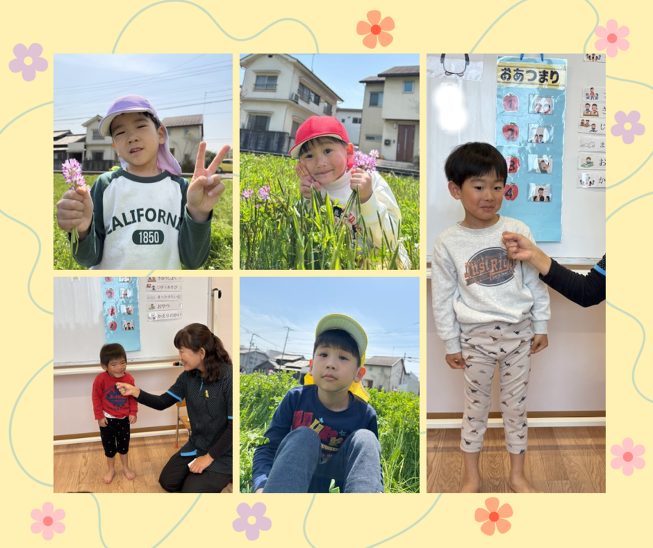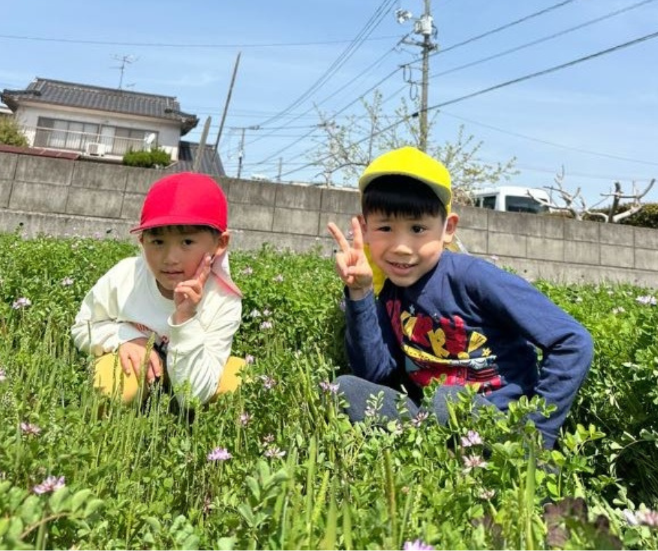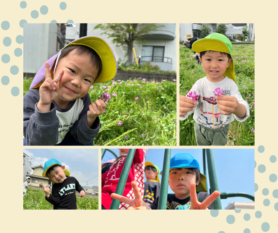 近くの公園まで歩いて行ったりれんげ畑に行ったりして遊んでいます。公園では、鬼ごっこをしたり滑り台やブランコでたくさん身体を動かして遊んでいます。れんげ畑では、カラーボールを隠して宝探しをしました。れんげの花の背丈が高かったり足場がでこぼこ道だったりしましたが、子どもたちはすごく楽しんでいました。れんげの花を摘んで花束を作り、「ママにプレゼントする」と言っている子もいて心がほっこりしました♡