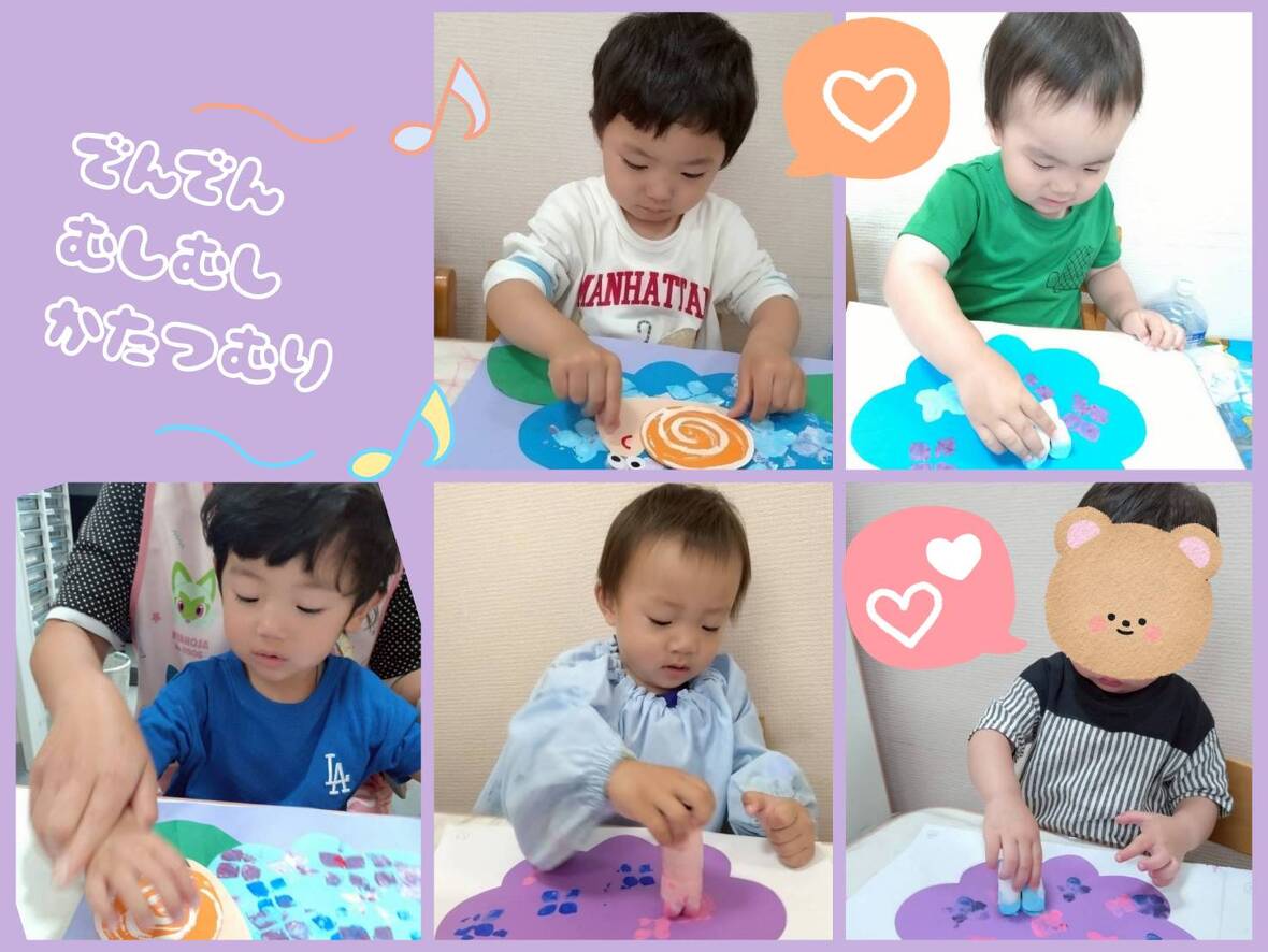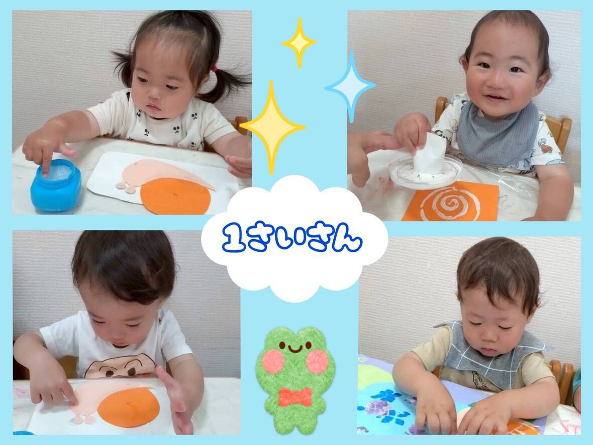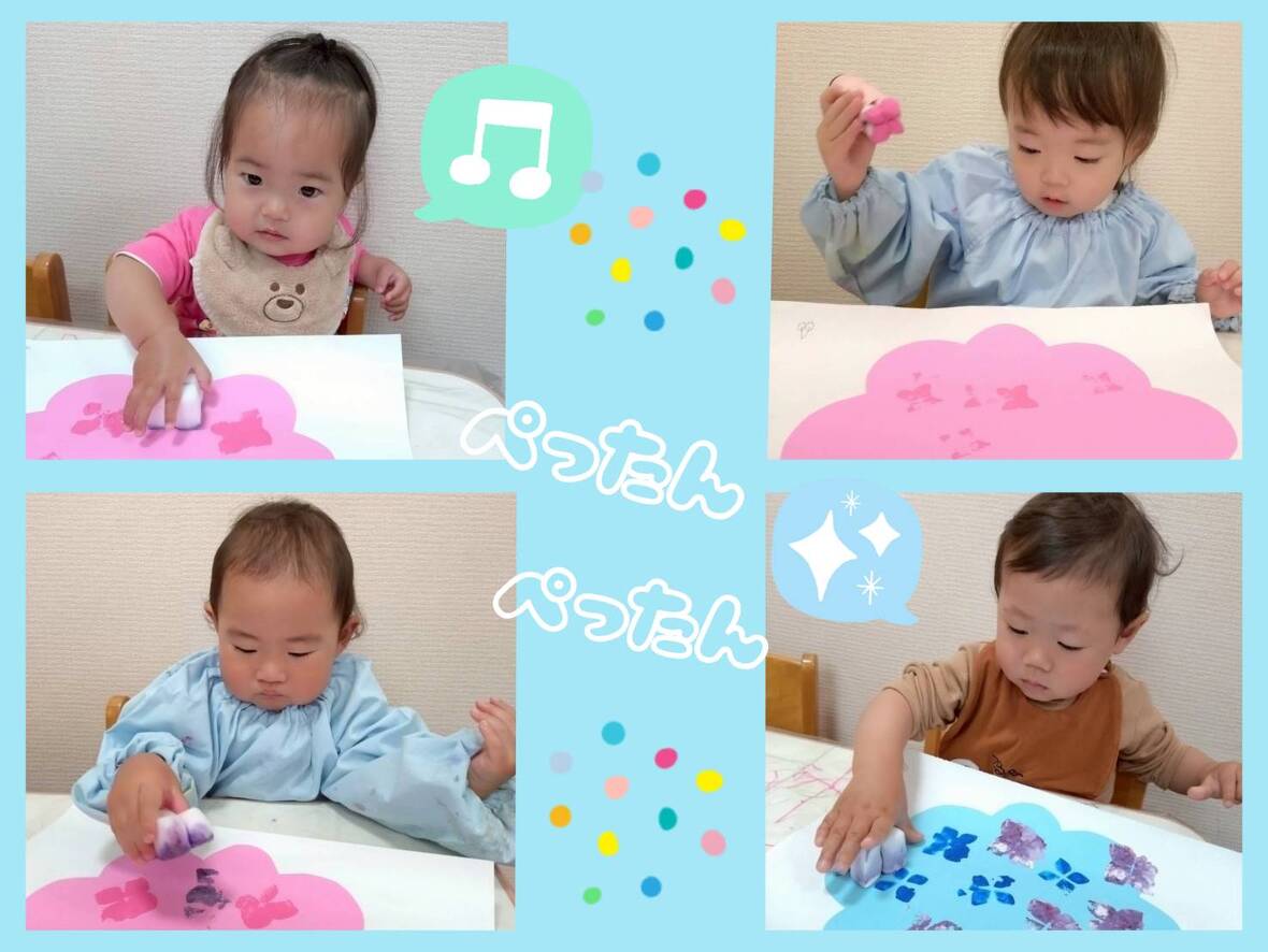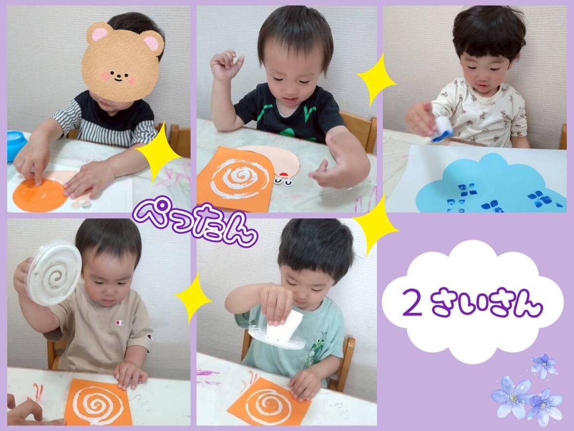 ぐるぐるスタンプでぺったんしたり、お花のスタンプをぺたぺたしたり、目や口を貼ったり、とっても楽しそうな子どもたち♡