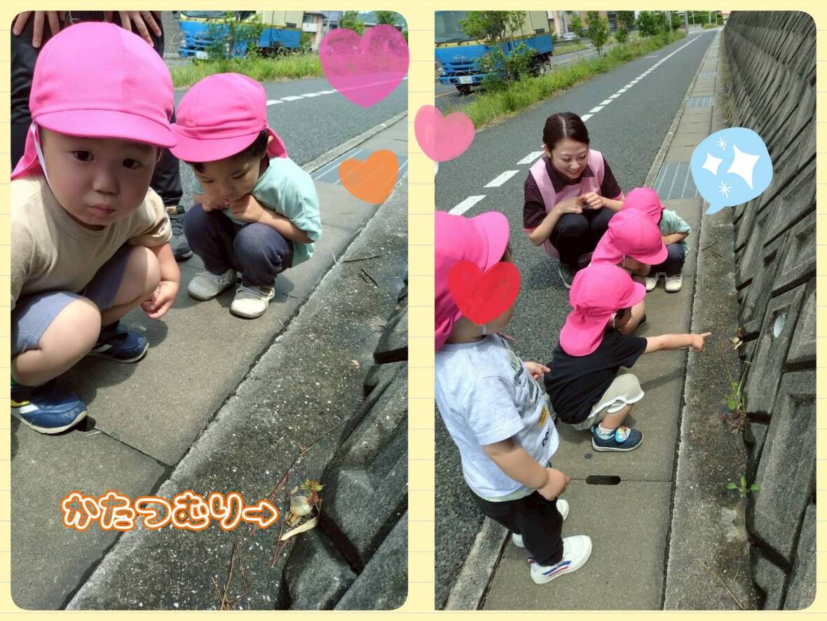 朝の会で歌っているかたつむりが目の前にいて、興味津々な子どもたちです(^^♪