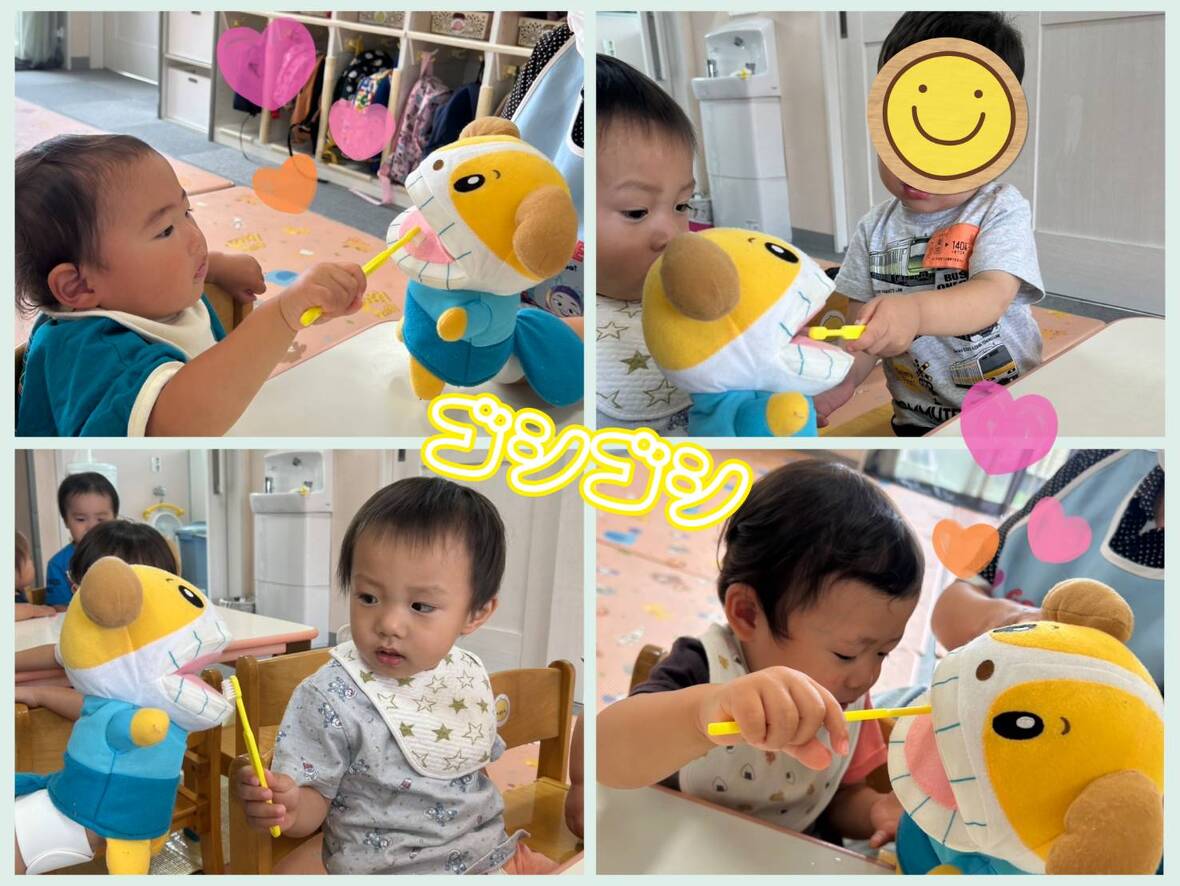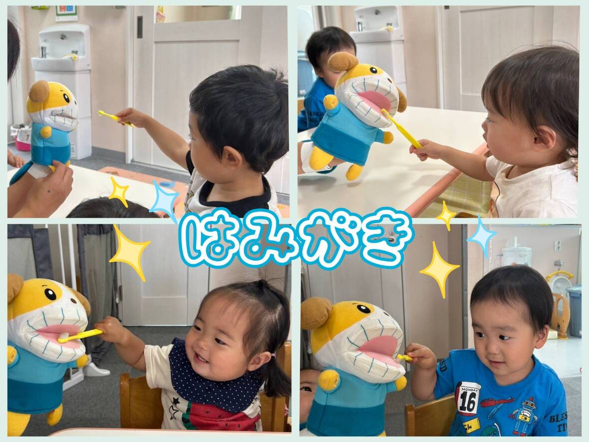 2歳さんは給食後にはみがきをします。先生にはみがきのお話を聞きながら、大切さを教わった後は、はみがきわんちゃんの登場です!