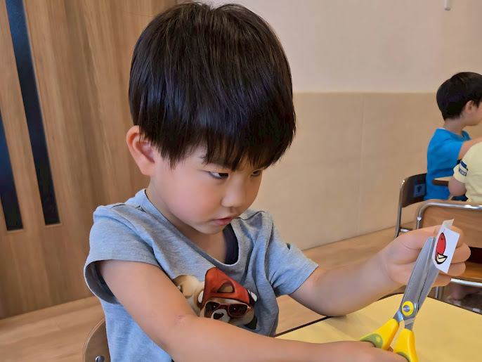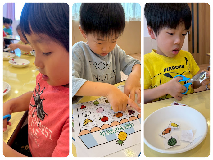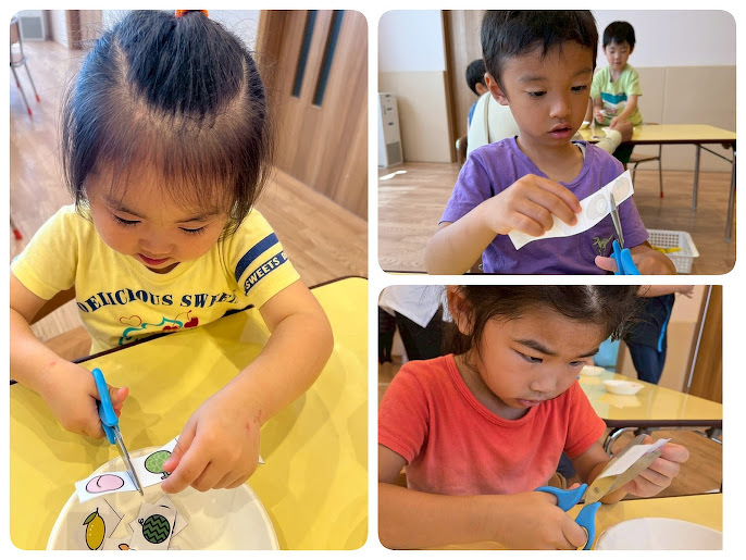 2025年08月30日(土) 活動ブログ くら・らぼ児発☆制作(ハサミの一回切りをしたよ) あひる組さんは、今回はじめてのはさみに挑戦しました。片手でグーパーと動かして、職員に見守られながら1人ずつゆっくり「チョッキン」と一回切り。 子どもたちは真剣な表情で集中し、切れたときには「できた!」とうれしそうな笑顔が見られました。 これからも、安全に気を付けながらはさみに慣れていけるように取り組んでいきたいと思います。