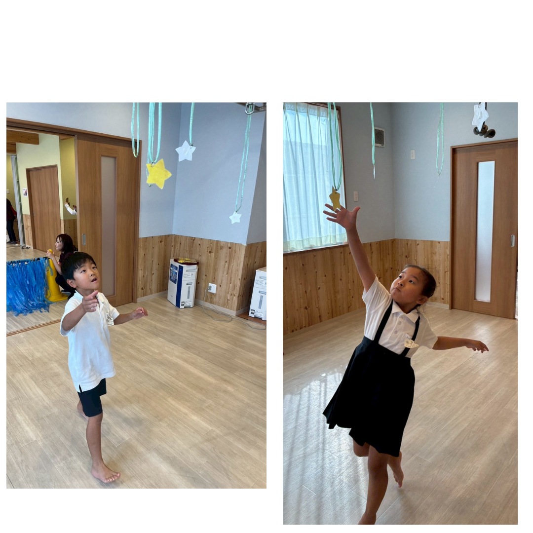 2025年09月04日(木) 活動ブログ 七夕行事を楽しみました!☆ こんにちは!アイリー・らぼ放デイです! 7月の七夕行事の活動の写真をお届けします。 皆で短冊を書いて笹に飾りました! 活動では、七夕ゲームを行いました! 上から吊り下げている星をジャンプして取ったり、 2人1組で風船運びをしました! 楽しみながら、バランス感覚や体幹を鍛えることができました!!